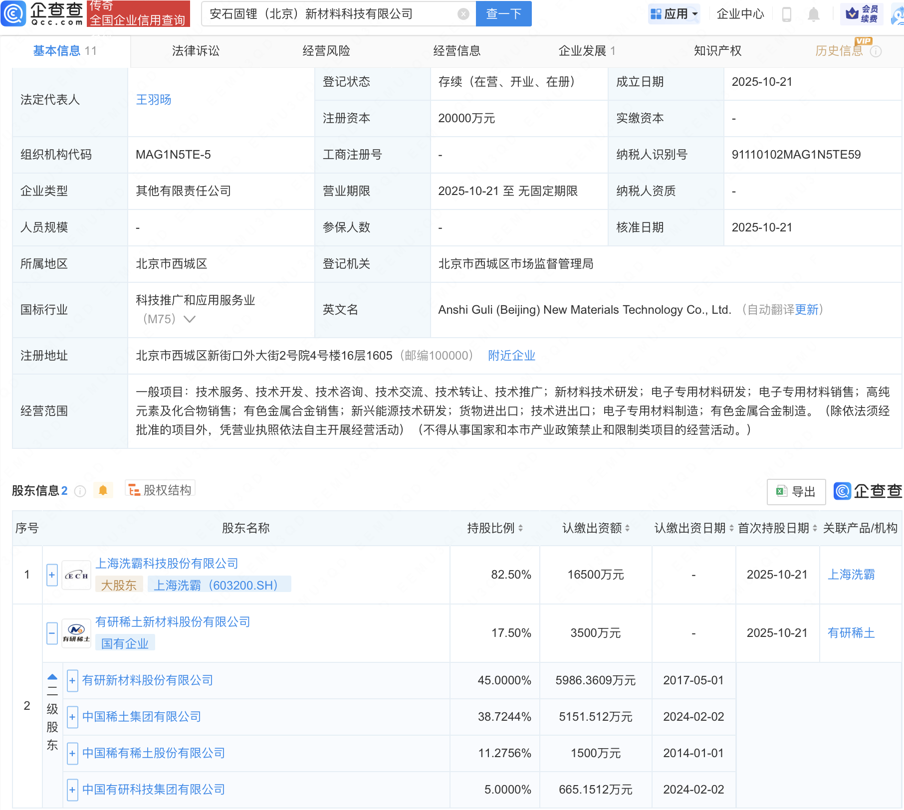 企查查APP显示,近日,安石固锂(北京)新材料科技有限公司成立,注册资本2亿元,经营范围包含:新材料技术研发;电子专用材料研发;电子专用材料销售;高纯元素及化合物销售等。企查查股权穿透显示,该公司由上海洗霸(603200)、有研新材(600206)持股企业有研稀土新材料股份有限公司共同持股。