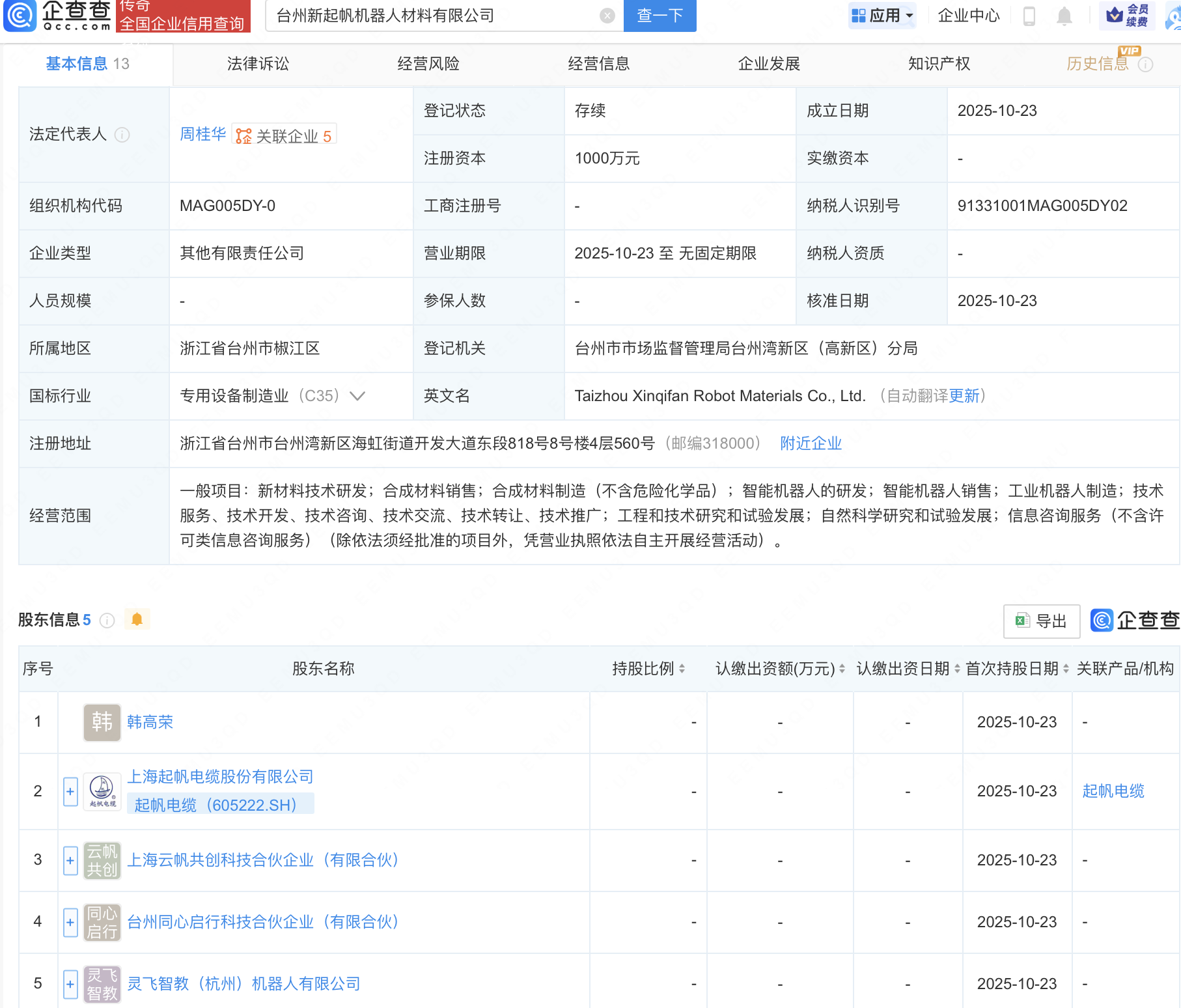企查查APP显示,近日,台州新起帆机器人材料有限公司成立,注册资本1000万元,经营范围包含:智能机器人的研发;智能机器人销售;工业机器人制造等。企查查股权穿透显示,该公司由起帆电缆(605222)等共同持股。
