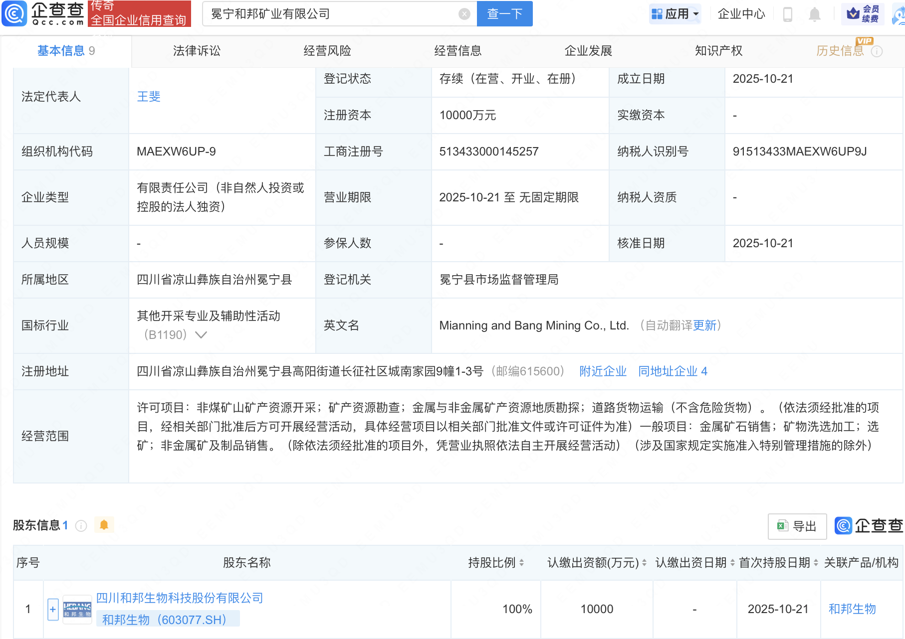 企查查APP显示,近日,冕宁和邦矿业有限公司成立,注册资本1亿元,经营范围包含:非煤矿山矿产资源开采;矿产资源勘查;金属与非金属矿产资源地质勘探等。企查查股权穿透显示,该公司由和邦生物(603077)全资持股。