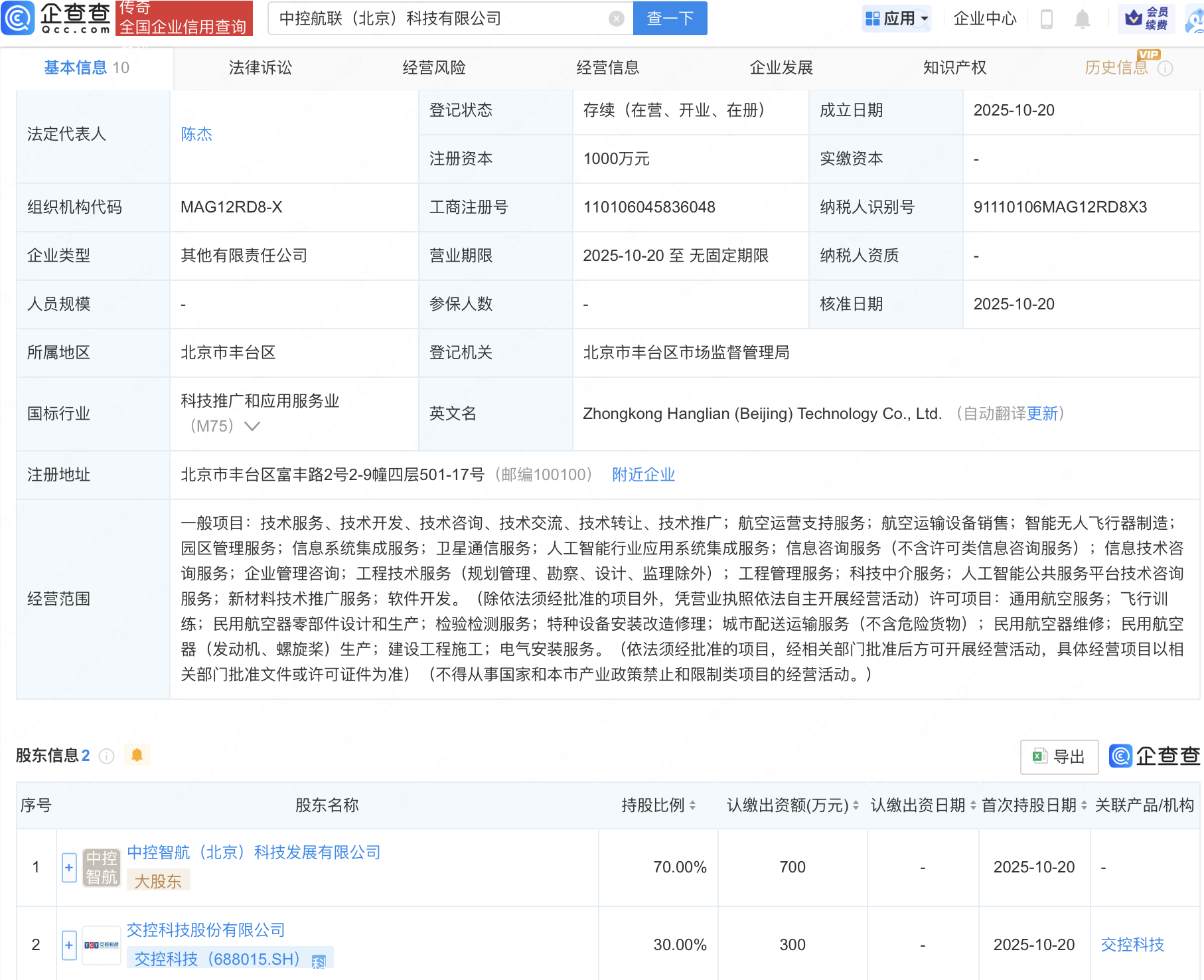 企查查APP显示,近日,中控航联(北京)科技有限公司成立,注册资本1000万元,经营范围包含:智能无人飞行器制造;人工智能行业应用系统集成服务;人工智能公共服务平台技术咨询服务;民用航空器零部件设计和生产等。企查查股权穿透显示,该公司由交控科技(688015)等共同持股。