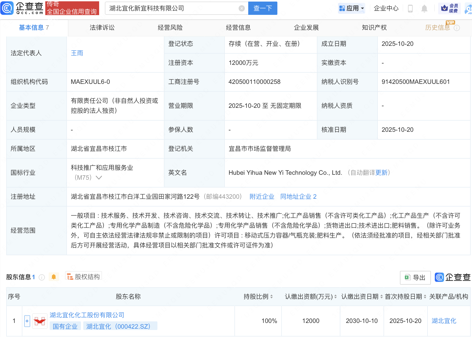 企查查APP显示,近日,湖北宜化新宜科技有限公司成立,注册资本1.2亿元,经营范围包含:货物进出口;技术进出口;肥料销售等。企查查股权穿透显示,该公司由湖北宜化(000422)全资持股。