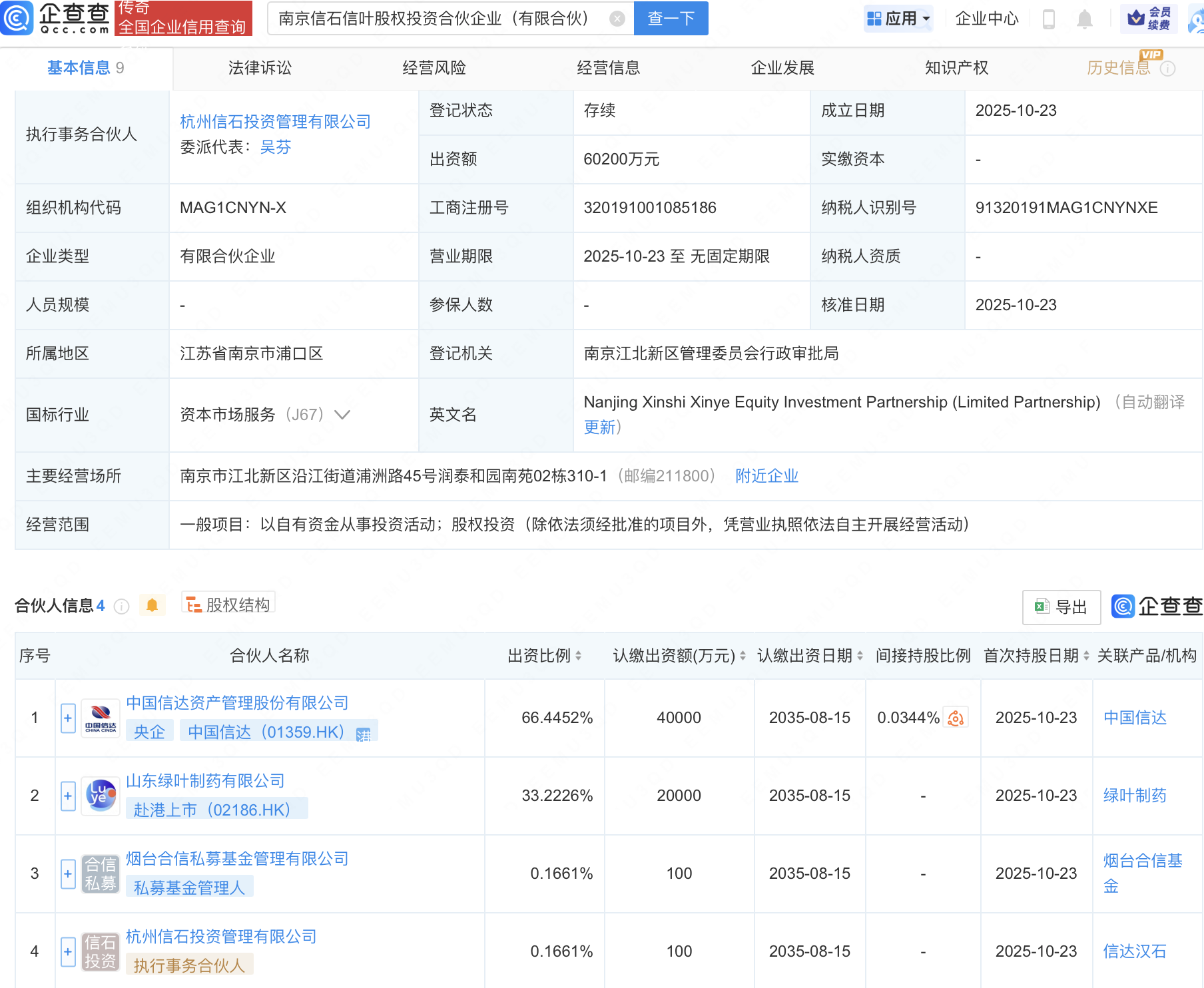 企查查APP显示,近日,南京信石信叶股权投资合伙企业(有限合伙)成立,出资额约6亿元,经营范围包含:以自有资金从事投资活动;股权投资。企查查股权穿透显示,该企业由中国信达(01359.HK)等共同出资。