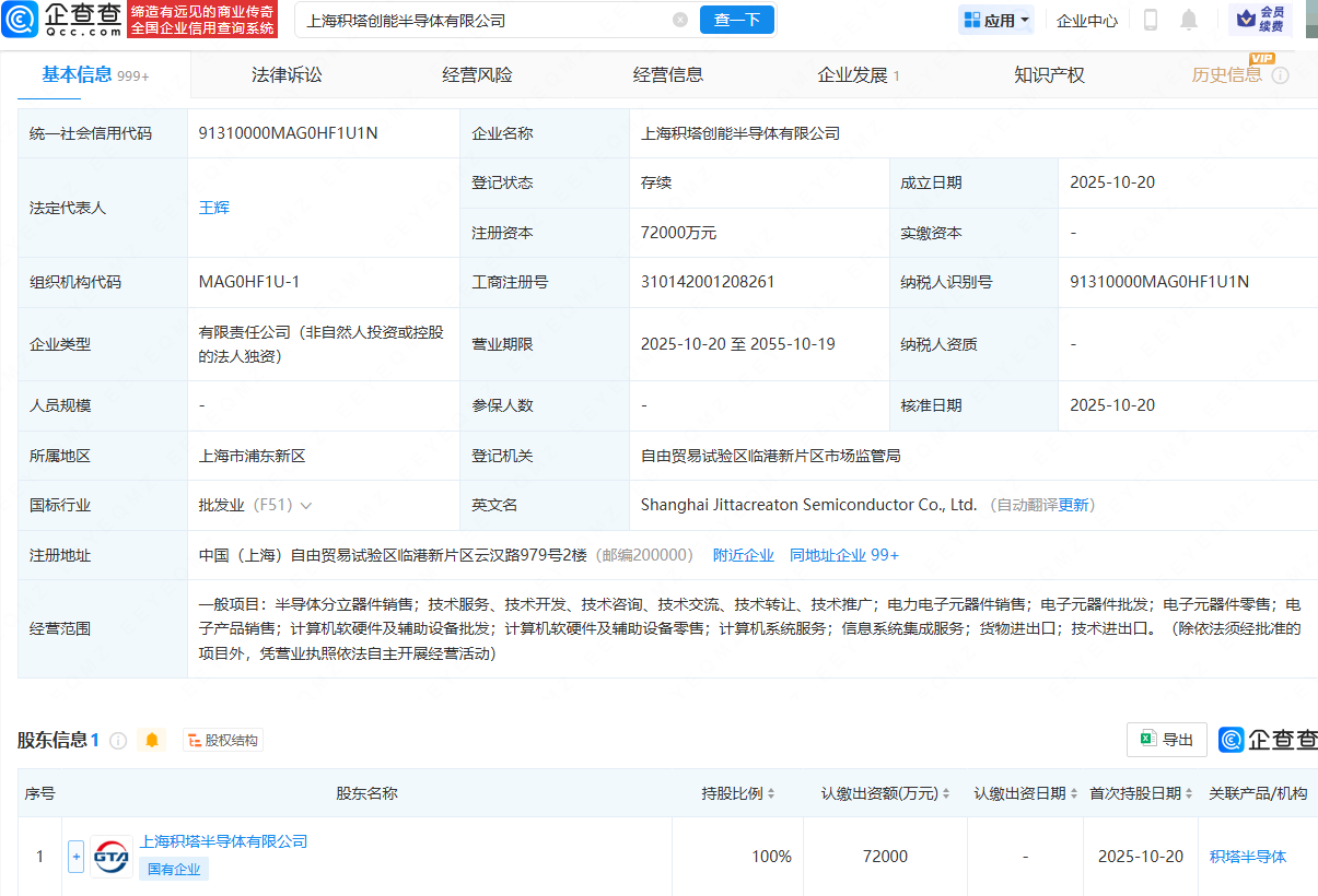 企查查APP显示,近日,上海积塔创能半导体有限公司成立,法定代表人为王辉,注册资本为7.2亿元,经营范围包含:半导体分立器件销售;电力电子元器件销售;电子元器件批发;电子元器件零售;电子产品销售等。企查查股权穿透显示,该公司由上海积塔半导体有限公司全资持股。