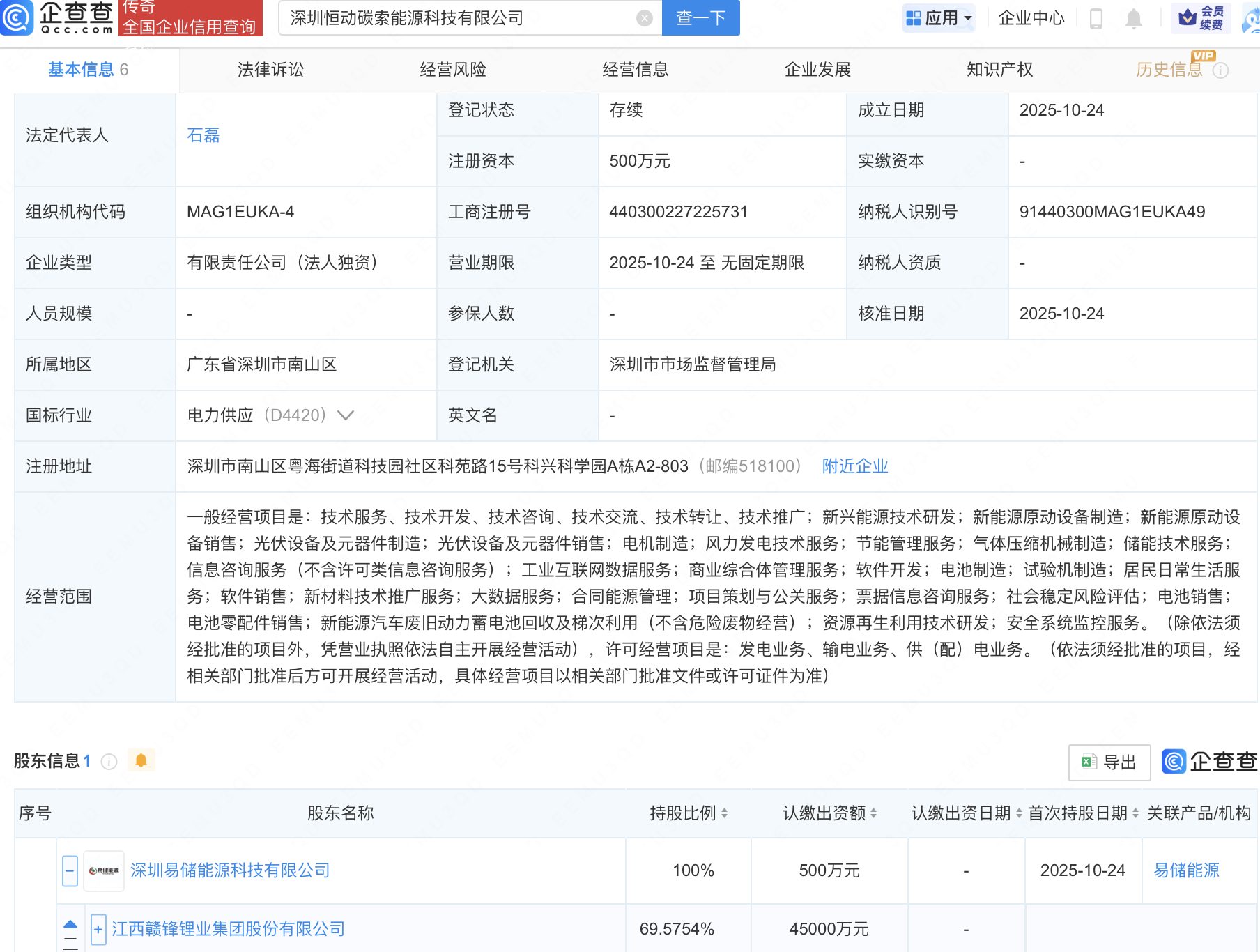 企查查APP显示,近日,深圳泰吉能源科技有限公司、深圳恒动碳索能源科技有限公司成立,法定代表人同为石磊,经营范围均包含:新兴能源技术研发;新能源原动设备制造;新能源原动设备销售;光伏设备及元器件制造等。企查查股权穿透显示,二者皆由赣锋锂业(002460)旗下深圳易储能源科技有限公司全资持股。