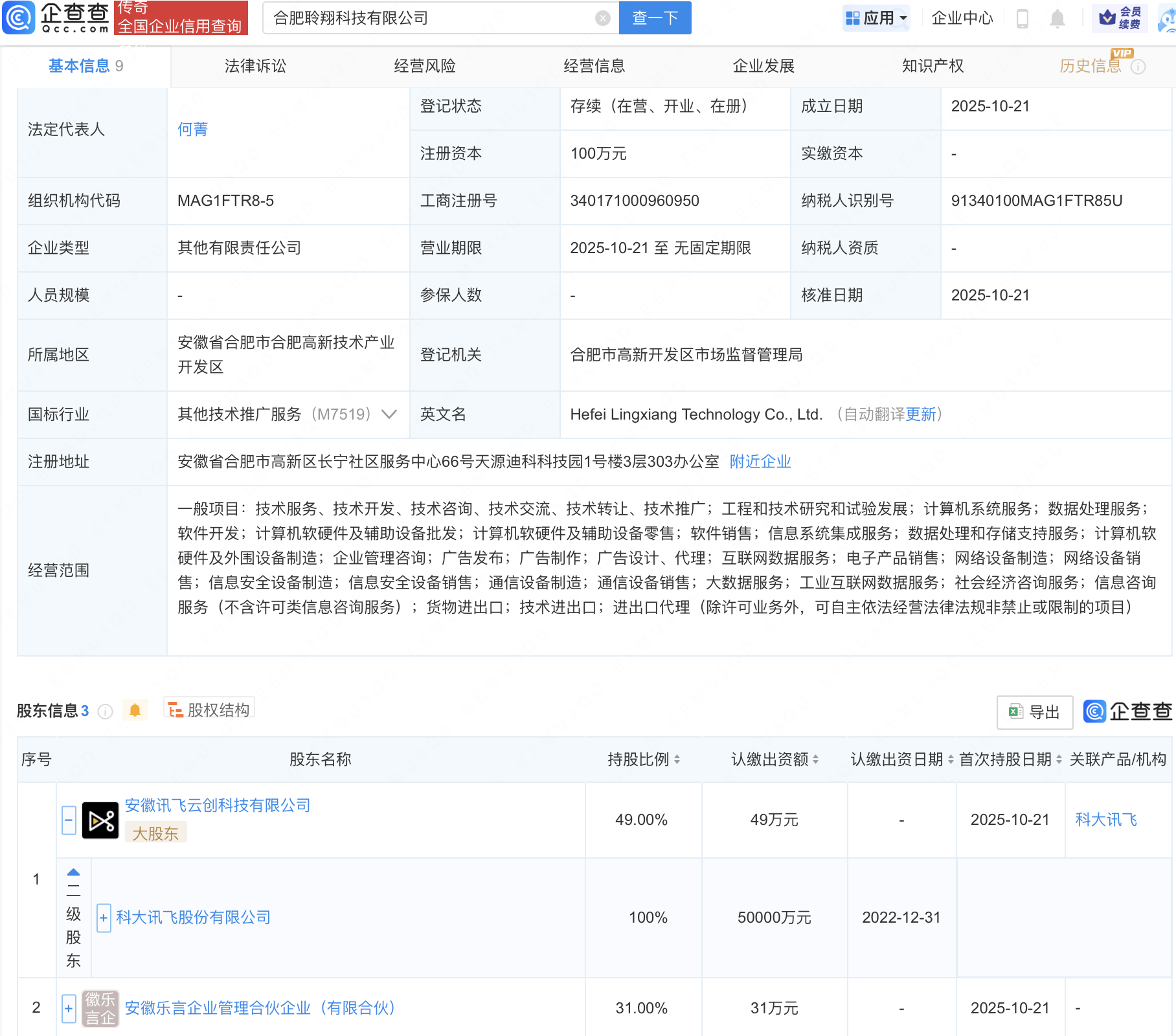 企查查APP显示,近日,合肥聆翔科技有限公司、合肥聆瀚科技有限公司成立,经营范围均包含:大数据服务;工业互联网数据服务;社会经济咨询服务等。企查查股权穿透显示,二者皆由科大讯飞(002230)全资子公司安徽讯飞云创科技有限公司等共同持股。