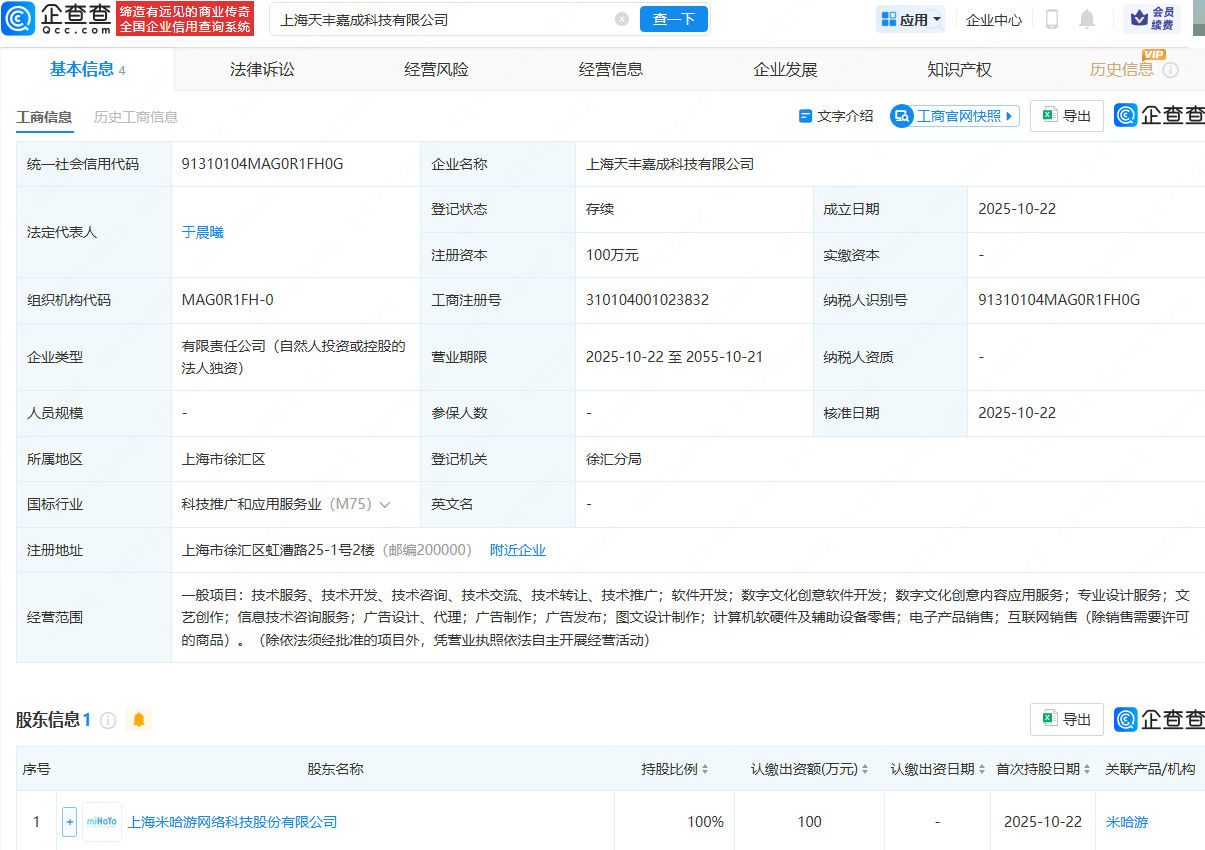 企查查APP显示,近日,上海天丰嘉成科技有限公司成立,法定代表人为于晨曦,经营范围包含:数字文化创意软件开发;数字文化创意内容应用服务;专业设计服务;文艺创作;信息技术咨询服务等。企查查股权穿透显示,该公司由上海米哈游网络科技股份有限公司全资持股。