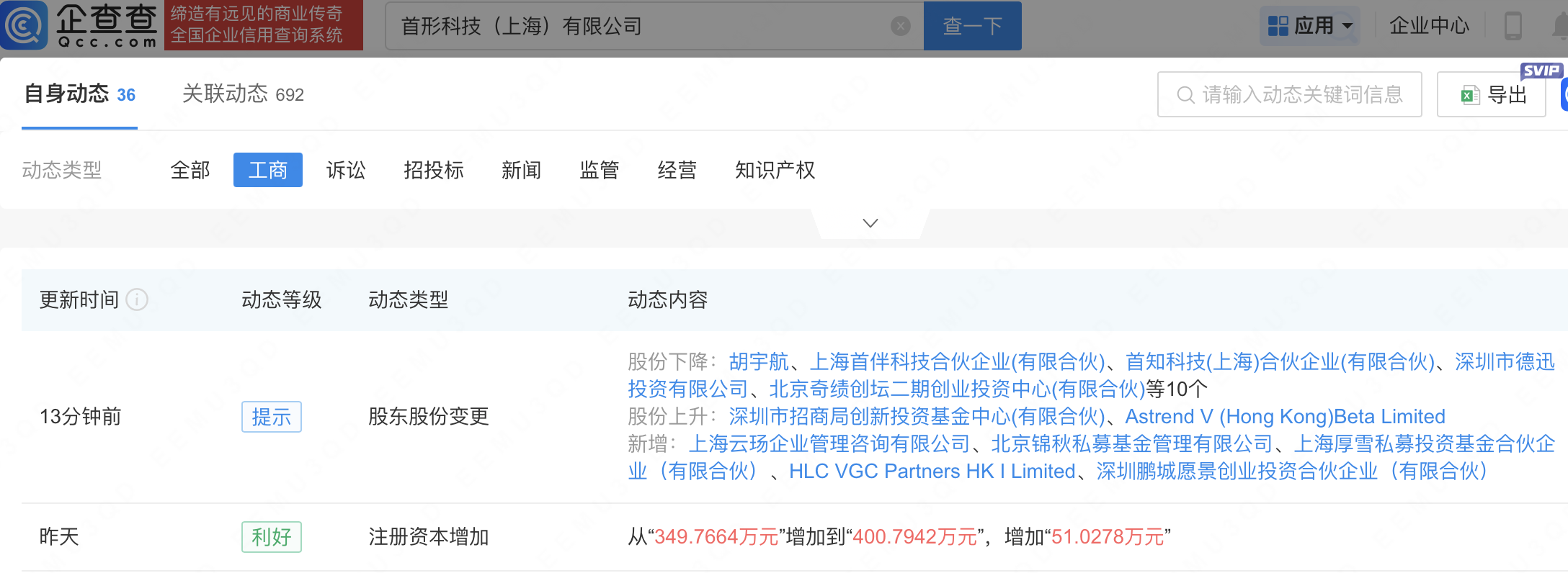 企查查APP显示,近日,首形科技(上海)有限公司发生工商变更,新增蚂蚁科技集团股份有限公司全资子公司上海云玚企业管理咨询有限公司等为股东,同时注册资本增至400.79万元。企查查信息显示,该公司成立于2024年,法定代表人为胡宇航,经营范围包含:智能机器人的研发;智能机器人销售;人工智能理论与算法软件开发;人工智能基础软件开发等。公开信息显示,首形科技是一家专注于高端、超仿生仿人机器人研发的企业,旨在为市场提供具有高度拟人化特征的机器人产品。