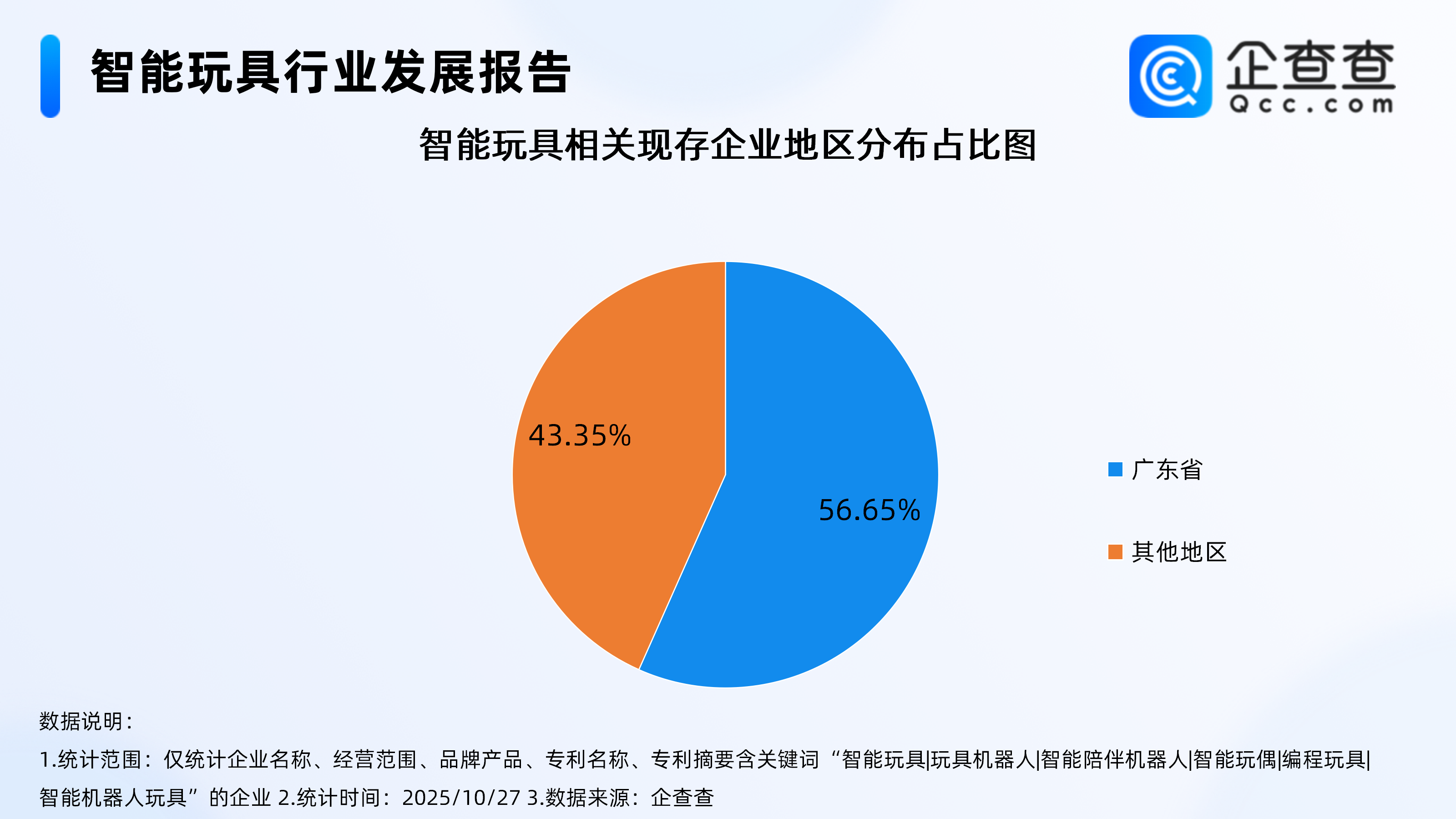 企查查数据显示,截至10月27日,国内智能玩具相关企业现存量达2450家,主要集中在广东省,占比达56.65%,广东省内智能玩具相关企业主要分布在深圳市、汕头市、东莞市等城市。其中,分布在深圳的智能玩具相关企业,占广东省相关企业存量的68.01%,占全国相关企业总存量的38.53%。