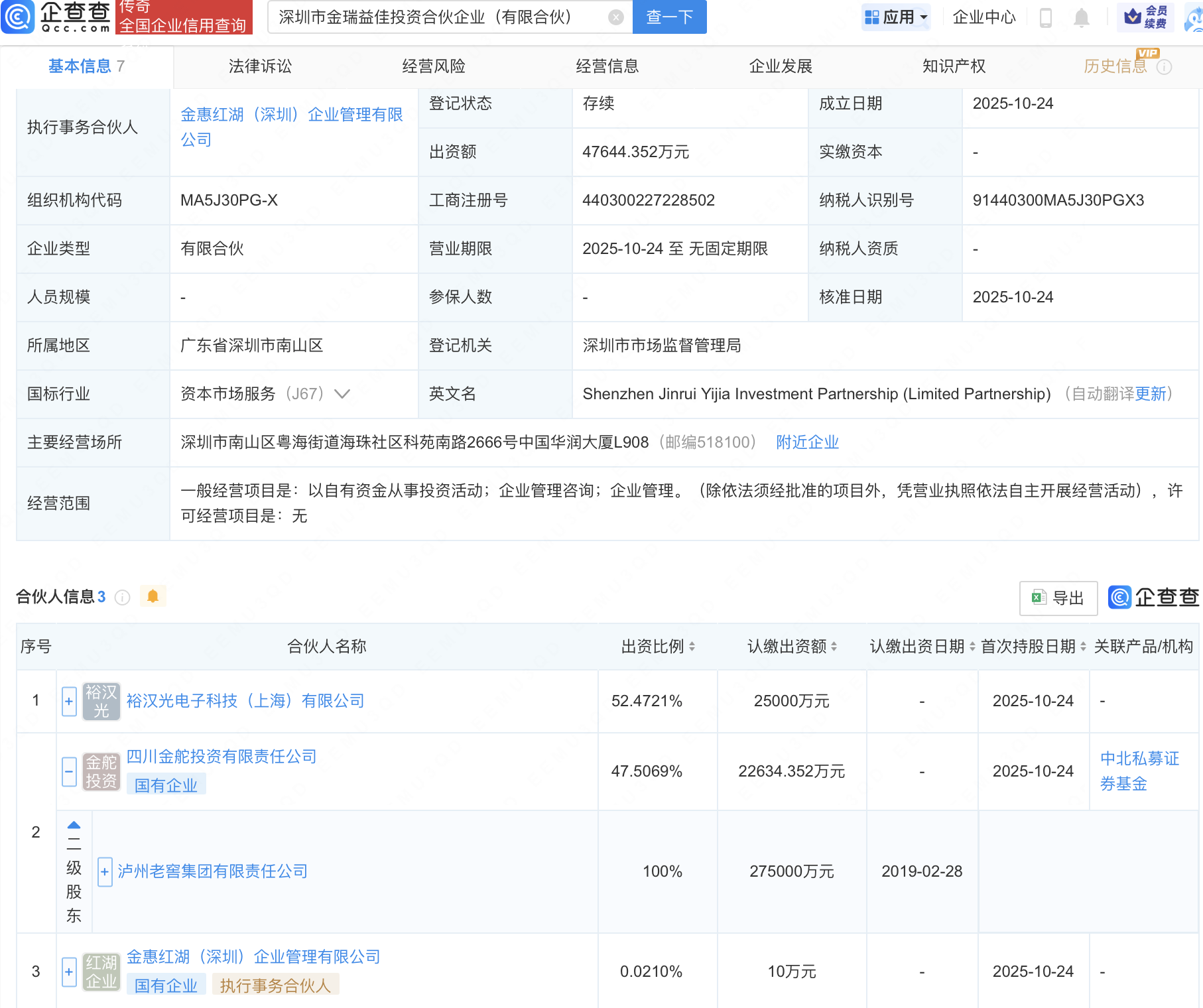 企查查APP显示,近日,深圳市金瑞益佳投资合伙企业(有限合伙)成立,出资额约4.76亿元,经营范围包含:以自有资金从事投资活动;企业管理咨询;企业管理。企查查股权穿透显示,该企业由泸州老窖集团有限责任公司全资子公司四川金舵投资有限责任公司等共同出资。
