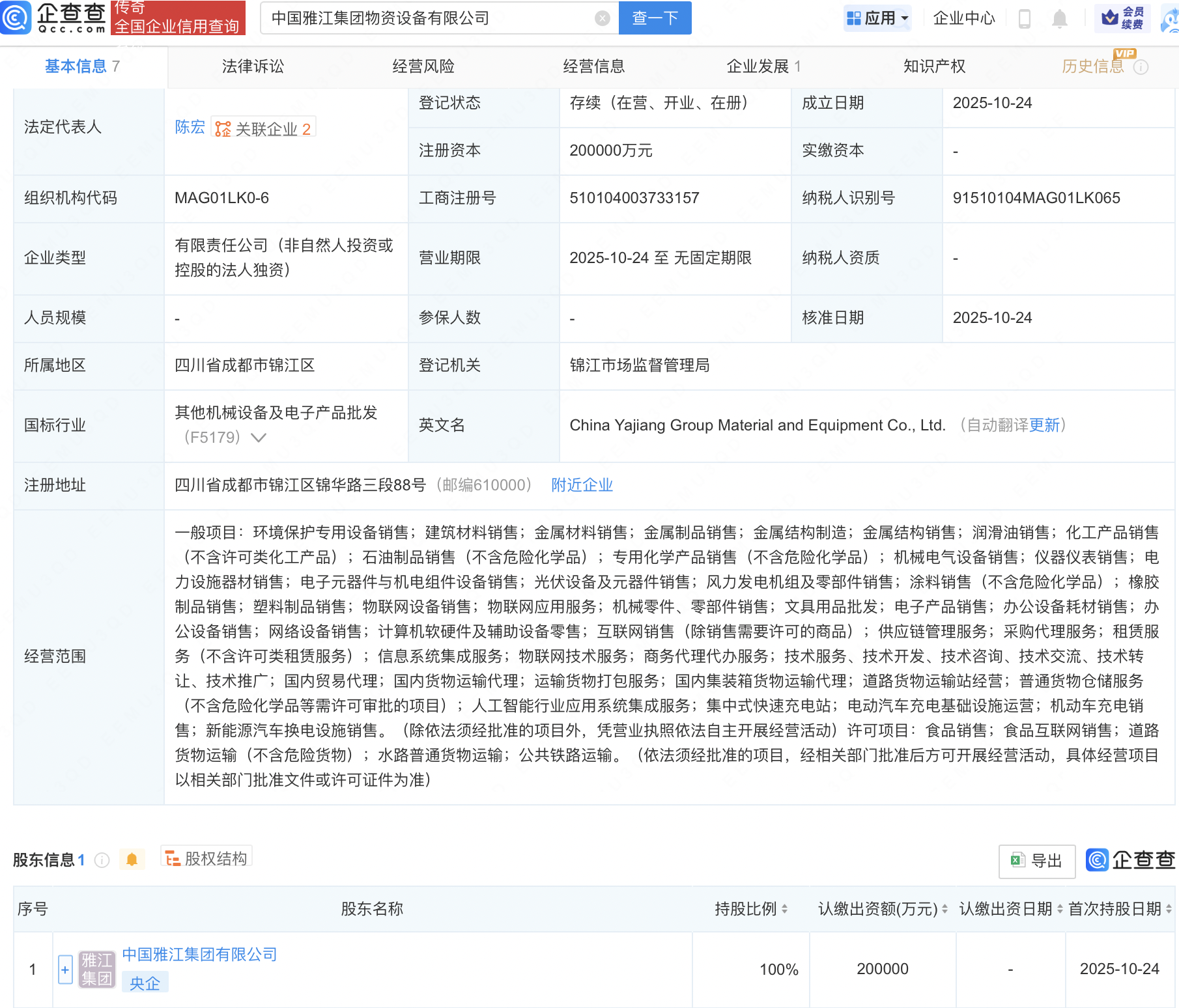 企查查APP显示,近日,中国雅江集团招标有限公司、中国雅江集团物资设备有限公司成立,注册资本分别为1亿元、20亿元,前者经营范围含招投标代理服务、工程造价咨询业务、采购代理服务等,后者经营范围含人工智能行业应用系统集成服务、集中式快速充电站、电动汽车充电基础设施运营等。企查查股权穿透显示,二者皆由中国雅江集团有限公司全资持股。