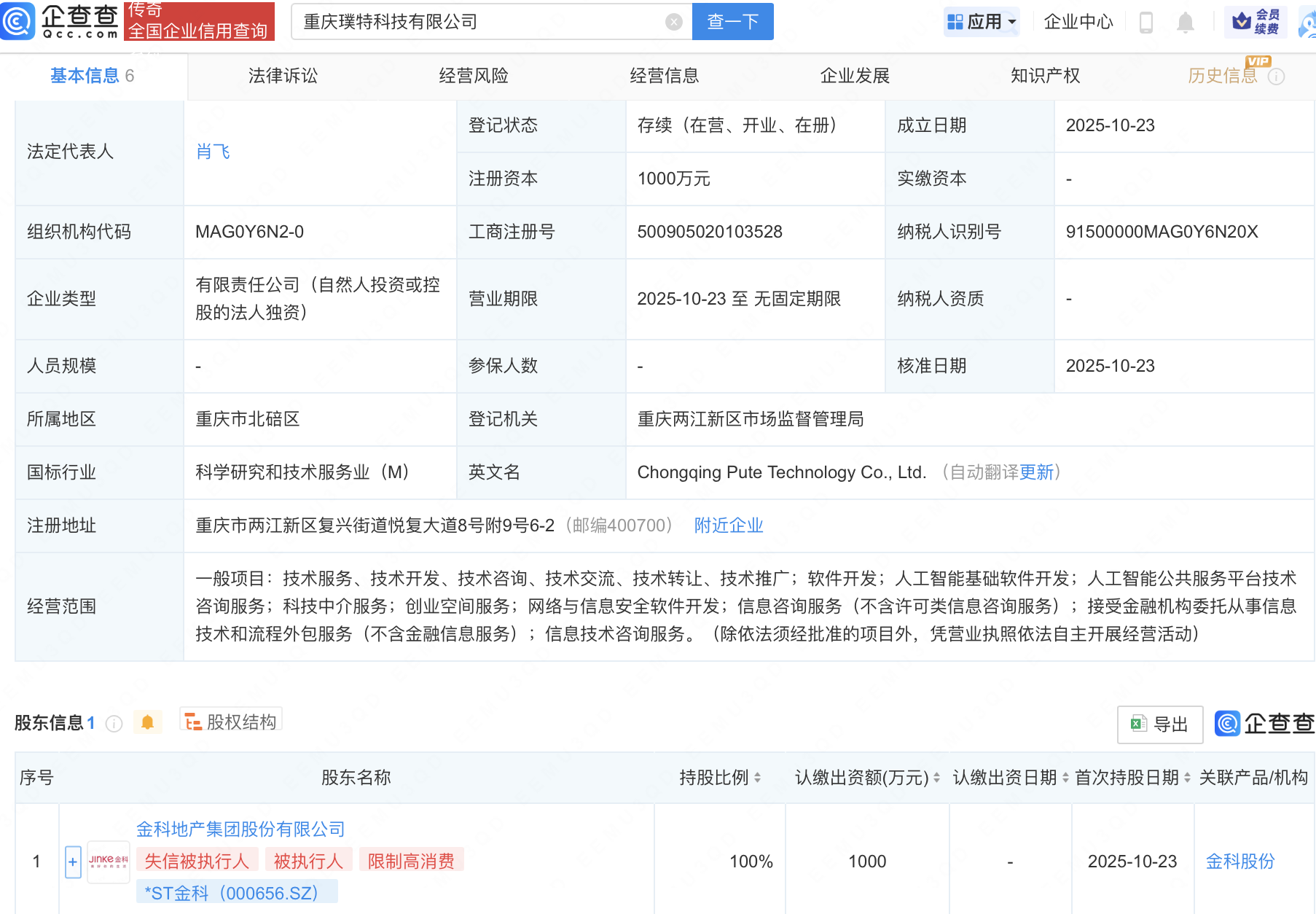 企查查APP显示,近日,重庆璞特科技有限公司成立,注册资本1000万元,经营范围包含:人工智能基础软件开发;人工智能公共服务平台技术咨询服务;科技中介服务;创业空间服务等。企查查股权穿透显示,该公司由*ST金科(000656)全资持股。