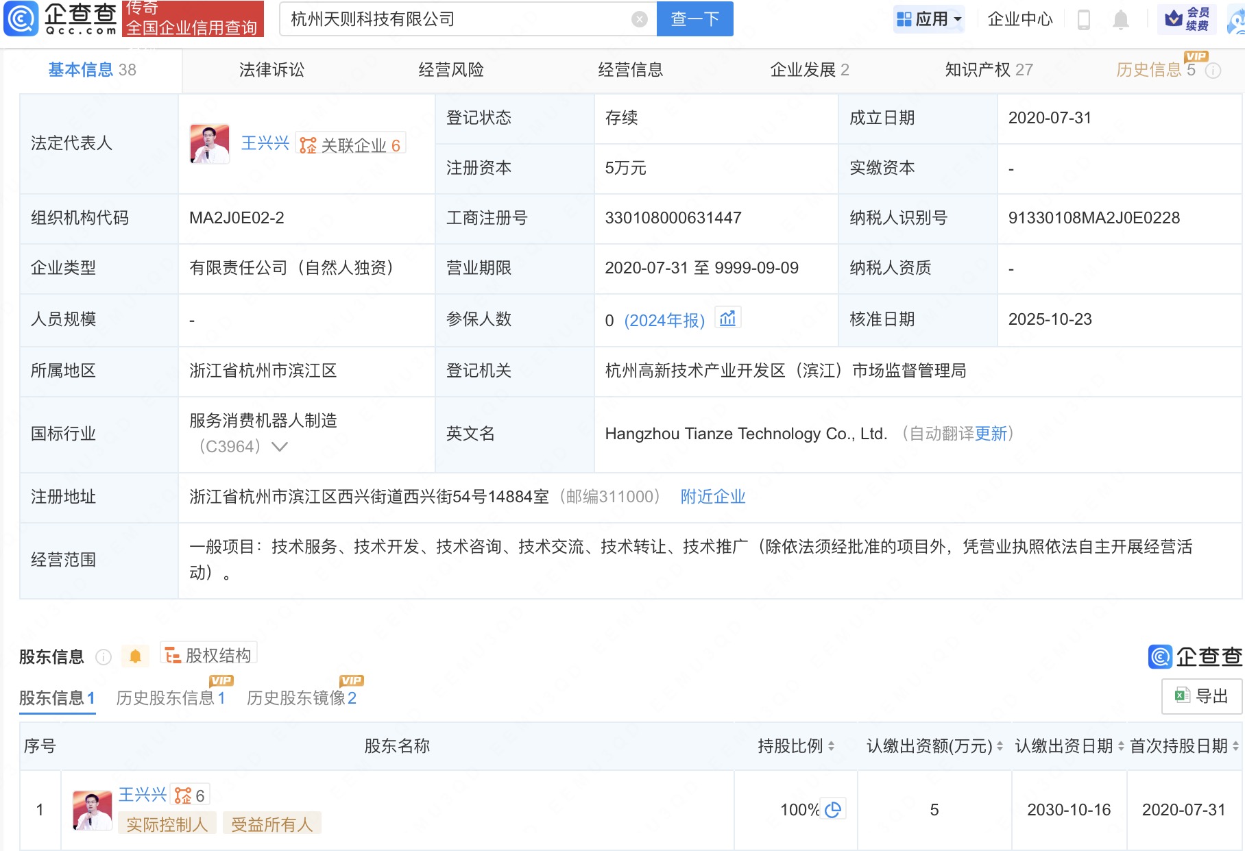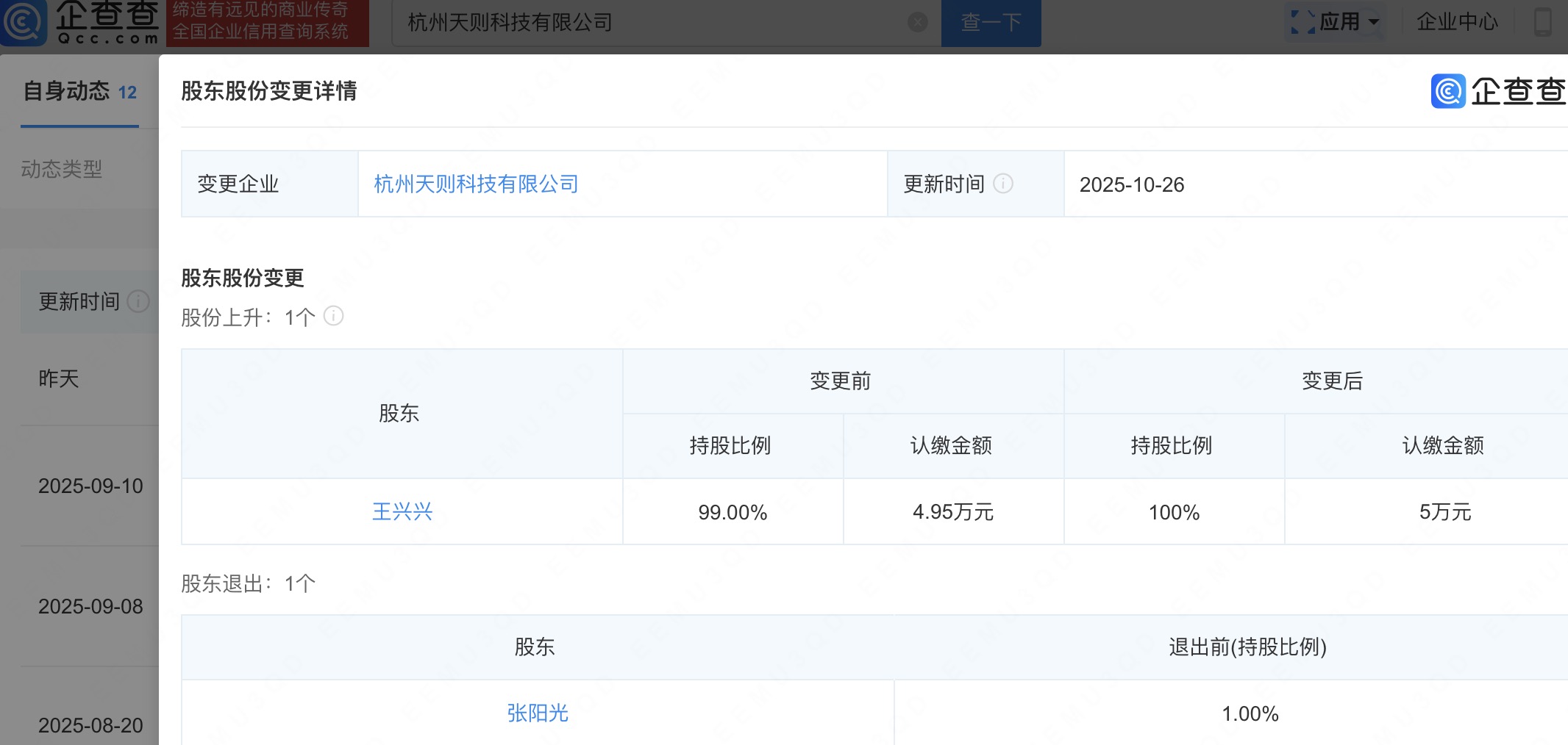 企查查APP显示,近日,杭州天则科技有限公司发生工商变更,原股东张阳光退出,王兴兴持股比例由99%变更为100%。企查查信息显示,该公司成立于2020年,法定代表人为王兴兴,注册资本5万人民币,经营范围包括技术服务、技术开发、技术咨询、技术推广等。