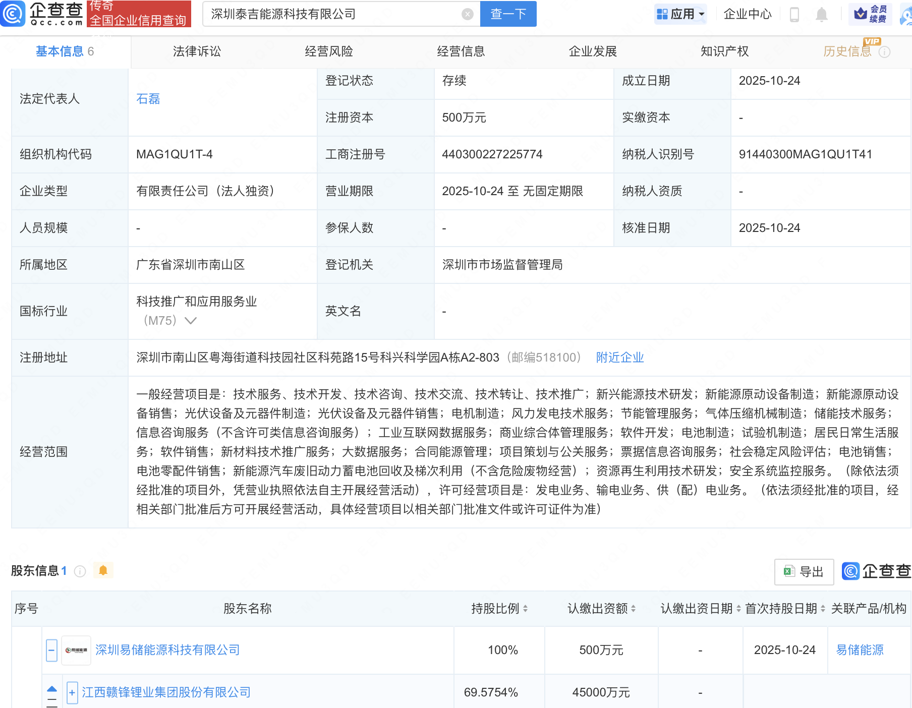 企查查APP显示,近日,深圳泰吉能源科技有限公司、深圳恒动碳索能源科技有限公司成立,法定代表人同为石磊,经营范围均包含:新兴能源技术研发;新能源原动设备制造;新能源原动设备销售;光伏设备及元器件制造等。企查查股权穿透显示,二者皆由赣锋锂业(002460)旗下深圳易储能源科技有限公司全资持股。