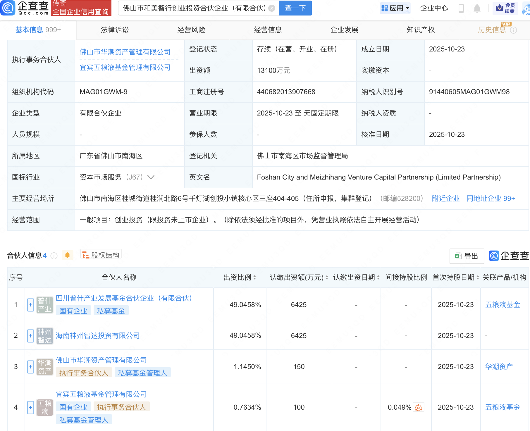 企查查APP显示,近日,佛山市和美智行创业投资合伙企业(有限合伙)成立,出资额1.31亿元,经营范围包含:创业投资(限投资未上市企业)。企查查股权穿透显示,该企业由宜宾五粮液基金管理有限公司、四川普什产业发展基金合伙企业(有限合伙)等共同出资。