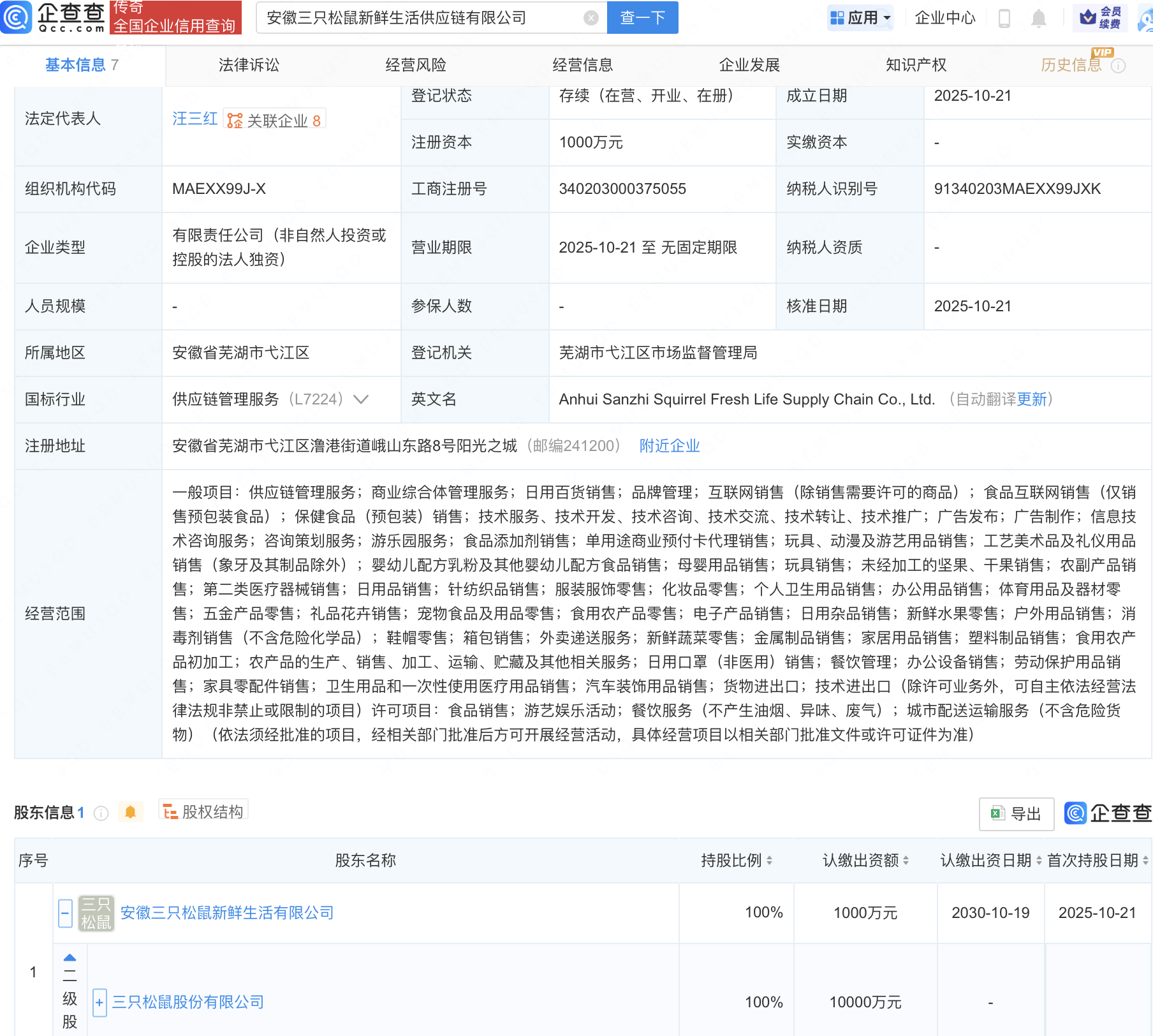 企查查APP显示,近日,安徽三只松鼠新鲜生活供应链有限公司成立,注册资本1000万元,经营范围包含:食用农产品初加工;农产品的生产、销售、加工、运输、贮藏及其他相关服务等。企查查股权穿透显示,该公司由三只松鼠(300783)间接全资持股。