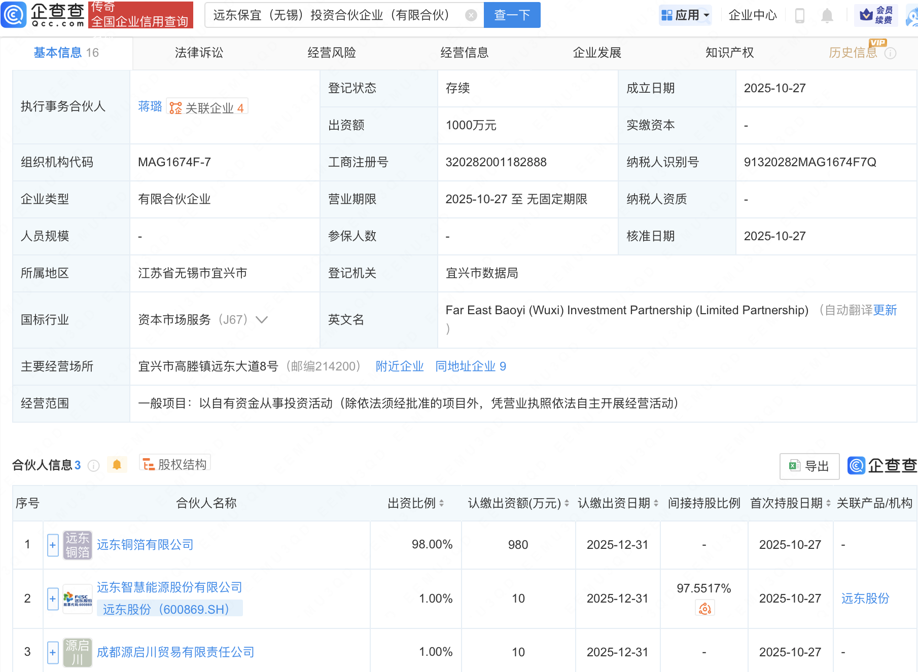 企查查APP显示,近日,远东保宜(无锡)投资合伙企业(有限合伙)成立,出资额1000万元,经营范围包含:以自有资金从事投资活动。企查查股权穿透显示,该企业由远东股份(600869)等共同出资。