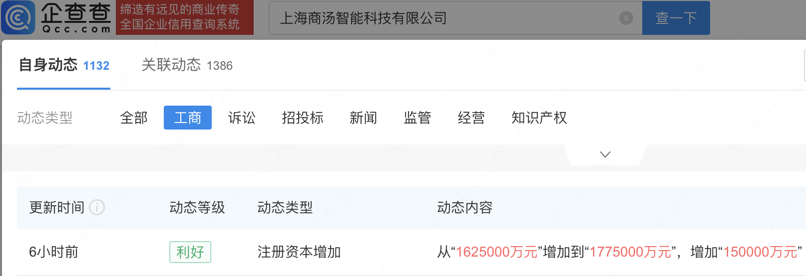 企查查APP显示,近日,上海商汤智能科技有限公司发生工商变更,注册资本由162.5亿元增至177.5亿元。企查查信息显示,该公司成立于2017年,法定代表人为杨帆,由商汤集团有限公司全资持股。