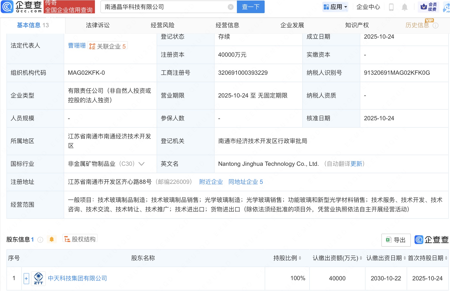 企查查APP显示,近日,南通晶华科技有限公司成立,法定代表人为曹珊珊,注册资本4亿人民币,经营范围包括光学玻璃制造、光学玻璃销售、功能玻璃和新型光学材料销售等。企查查股权穿透显示,该公司由中天科技集团有限公司全资持股。