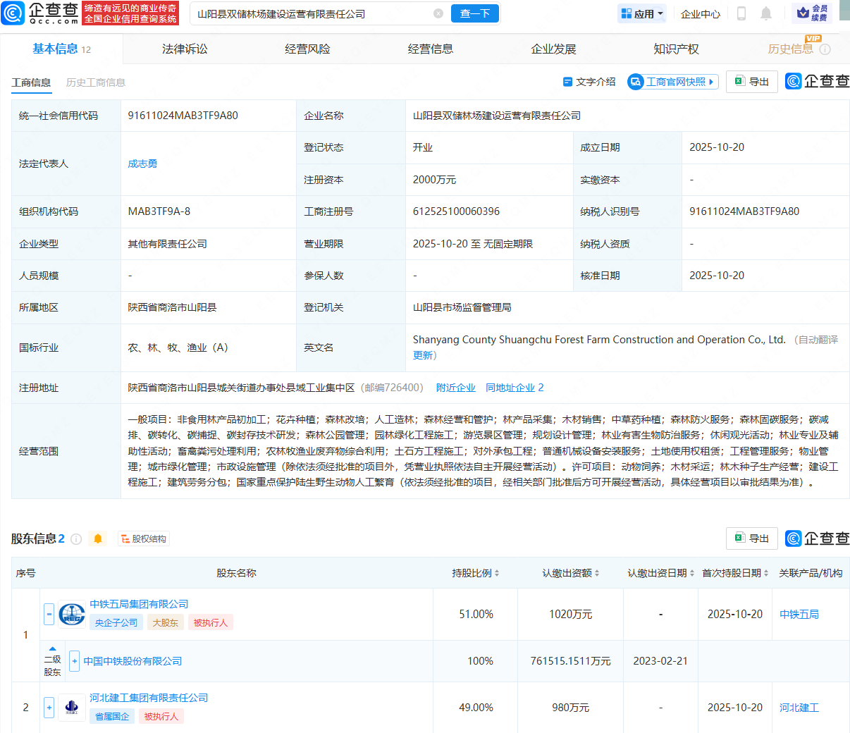 企查查APP显示,近日,山阳县双储林场建设运营有限责任公司成立,法定代表人为成志勇,注册资本为2000万元,经营范围包含:花卉种植;森林改培;人工造林;森林经营和管护;林产品采集;木材销售;中草药种植等。企查查股权穿透显示,该公司由中国中铁(601390)全资子公司中铁五局集团有限公司、河北建工集团有限责任公司共同持股。