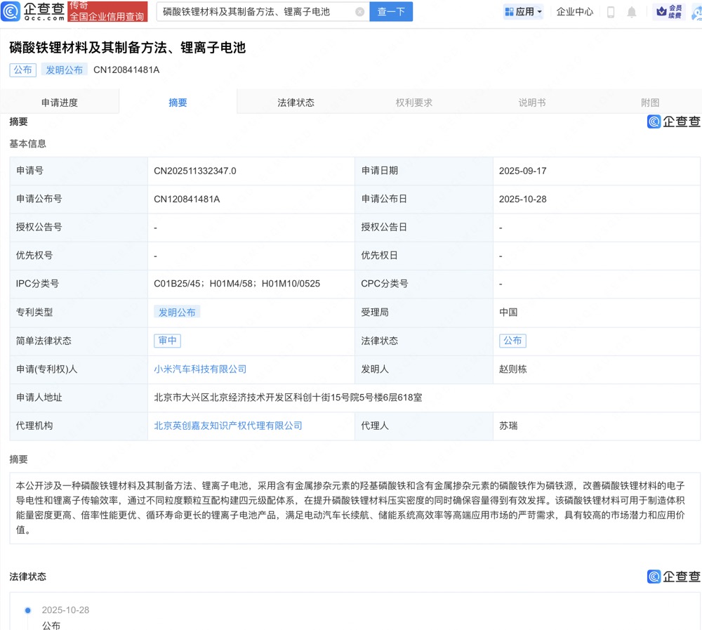 企查查APP显示,近日,小米汽车科技有限公司申请的“磷酸铁锂材料及其制备方法、锂离子电池”专利公布。企查查专利摘要显示,本公开采用含有金属掺杂元素的羟基磷酸铁和含有金属掺杂元素的磷酸铁作为磷铁源,改善磷酸铁锂材料的电子导电性和锂离子传输效率,通过不同粒度颗粒互配构建四元级配体系,在提升磷酸铁锂材料压实密度的同时确保容量得到有效发挥。该磷酸铁锂材料可用于制造体积能量密度更高、倍率性能更优、循环寿命更长的锂离子电池产品,满足电动汽车长续航、储能系统高效率等高端应用市场的严苛需求,具有较高的市场潜力和应用价值。