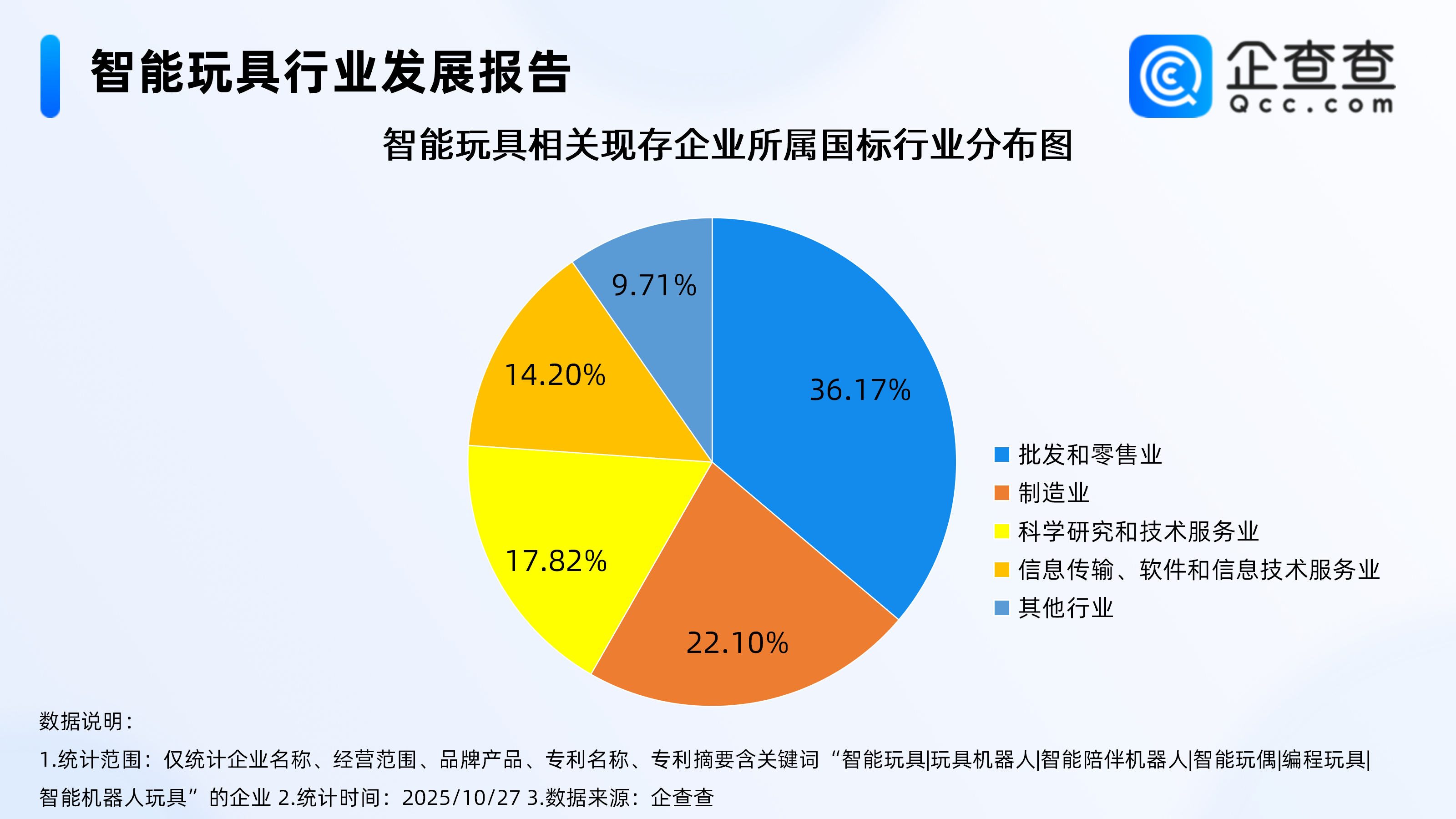 企查查数据显示,从国标行业分布来看,国内智能玩具相关现存企业中,归属于批发和零售业的相关企业最多,占比达36.17%,其次为制造业、科学研究和技术服务业,分别占比22.1%、17.82%。