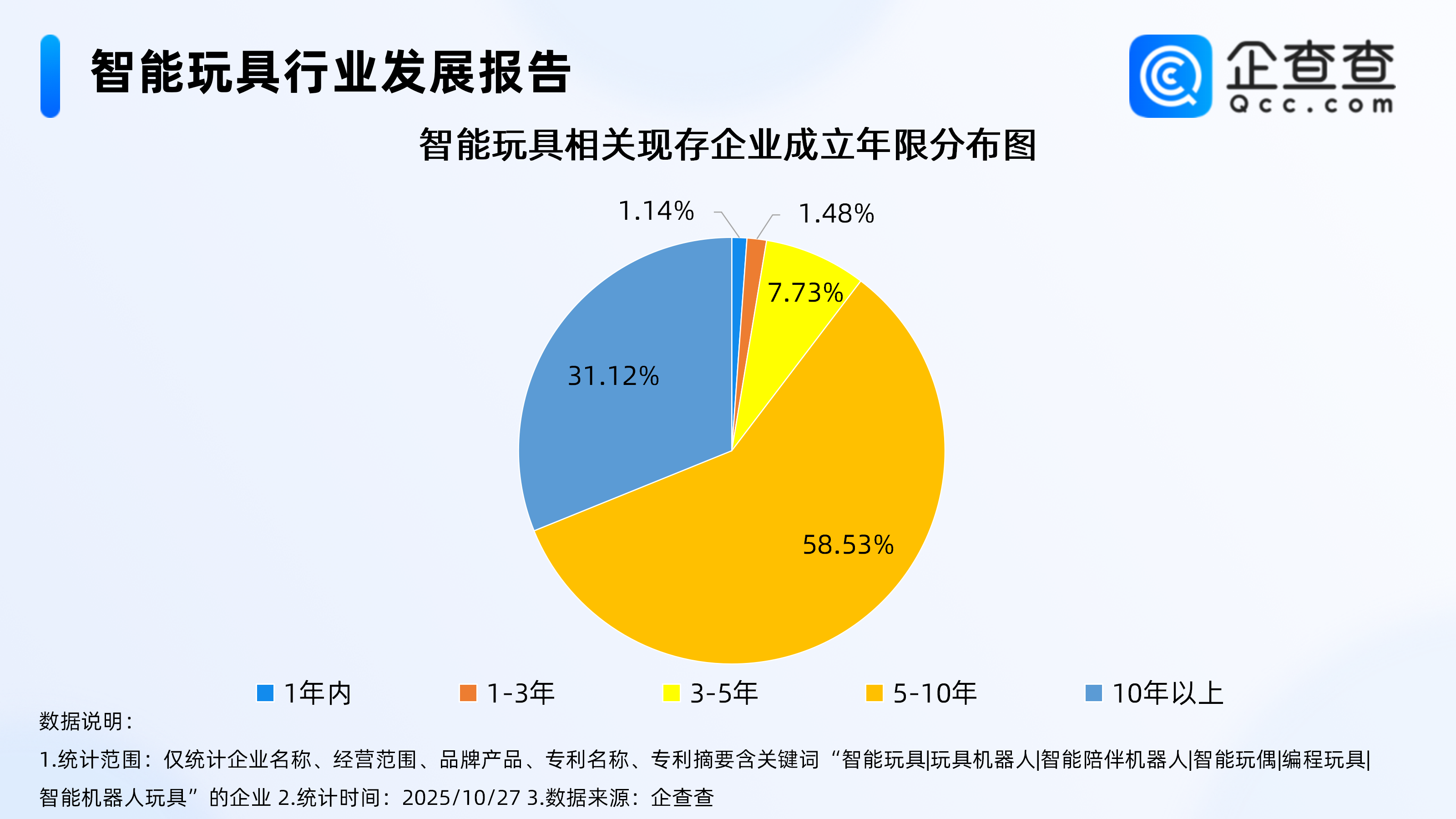 企查查数据显示,从成立年限来看,国内智能玩具相关现存企业多成立于5年以上,其中成立年限在5-10年的相关企业,占比达58.53%,成立于10年以上的相关企业,占比达31.12%。