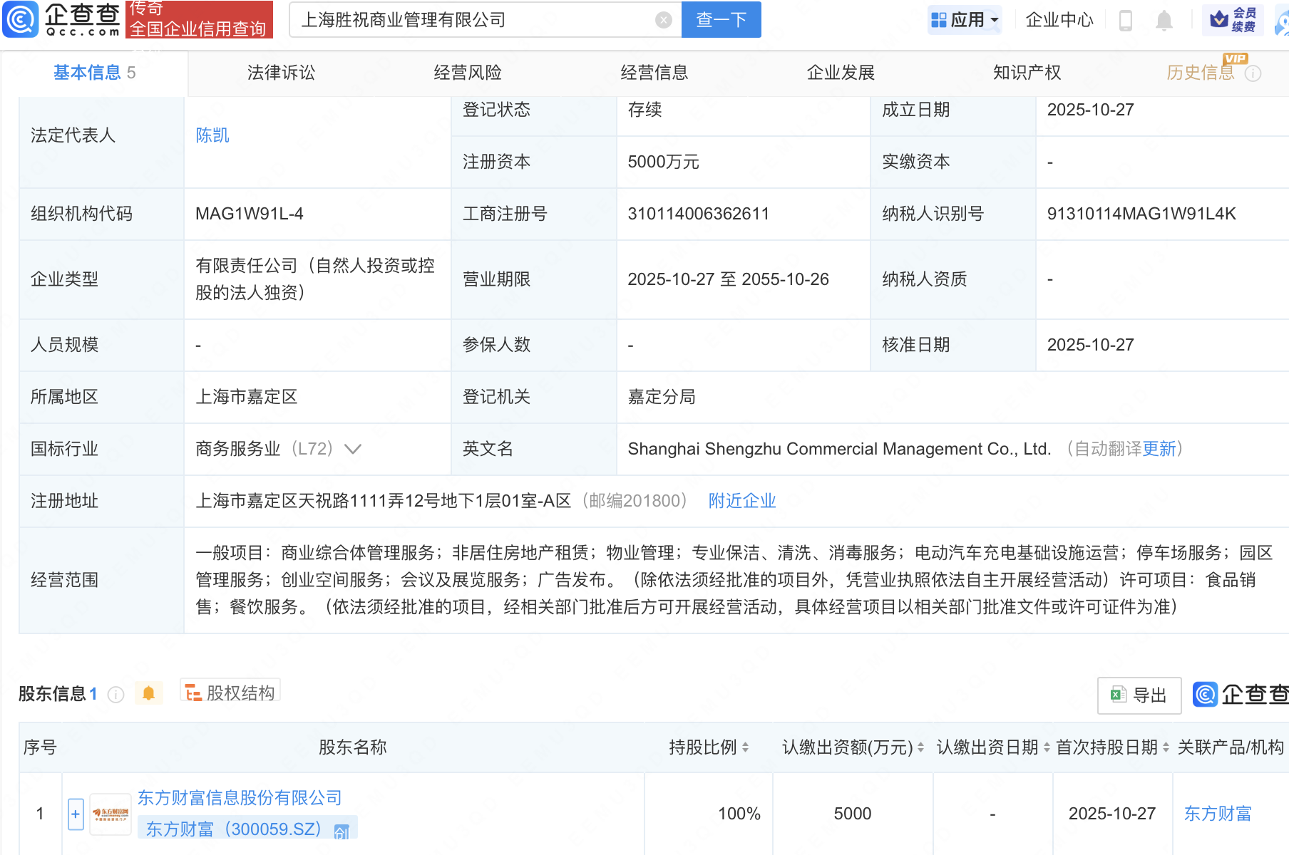 企查查APP显示,近日,上海胜祝商业管理有限公司成立,注册资本5000万元,经营范围包含:商业综合体管理服务;非居住房地产租赁;物业管理;电动汽车充电基础设施运营等。企查查股权穿透显示,该公司由东方财富(300059)全资持股。