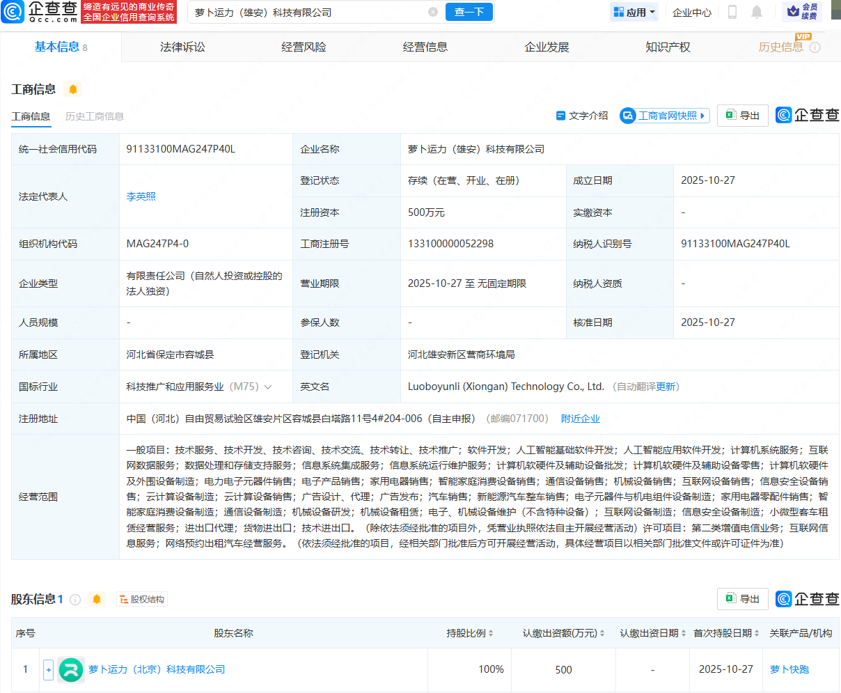 企查查APP显示,近日,萝卜运力(雄安)科技有限公司成立,法定代表人为李英照,经营范围包含:人工智能基础软件开发;人工智能应用软件开发;计算机系统服务;智能家庭消费设备制造等。企查查股权穿透显示,该公司由萝卜快跑关联公司萝卜运力(北京)科技有限公司全资持股。