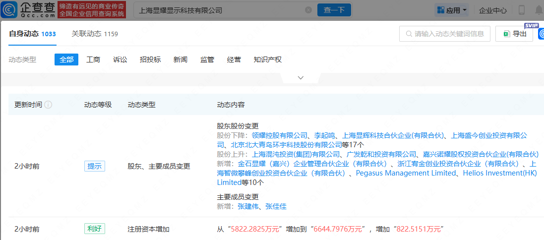 企查查APP显示,近日,上海显耀显示科技有限公司发生工商变更,注册资本增加到6644.80万元,新增茅台金石基金旗下金石显耀(嘉兴)企业管理合伙企业(有限合伙)、浙江宥金创业投资合伙企业(有限合伙)等为股东,同时,公司主要人员亦发生变更。