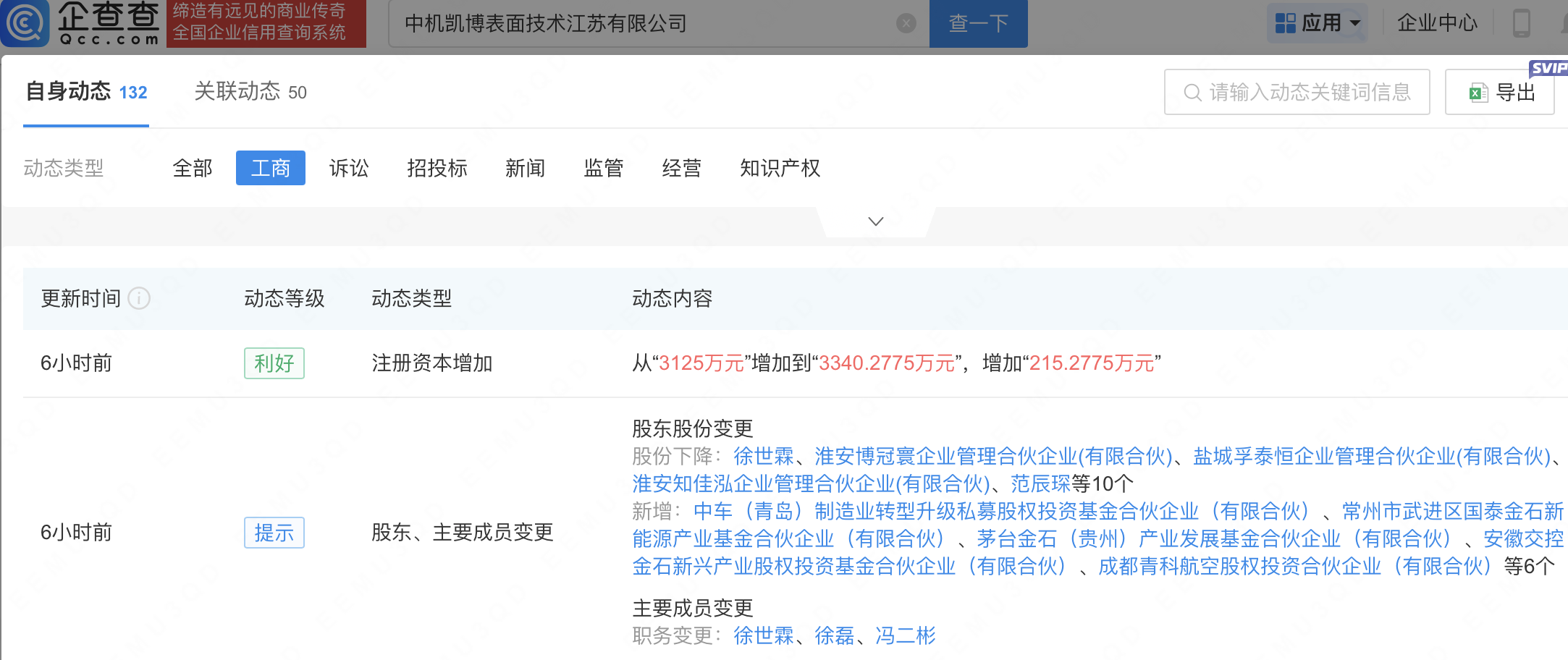 企查查APP显示,近日,中机凯博表面技术江苏有限公司发生工商变更,新增茅台金石(贵州)产业发展基金合伙企业(有限合伙)等为股东,同时注册资本增至3340.28万元。企查查信息显示,该公司成立于2019年,法定代表人为徐世霖,经营范围包含:特种陶瓷材料涂层、金属材料涂层、有机材料涂层、复合材料涂层(以上均除危险化学品)的技术研发等。据其官网,中机凯博是一家专注于为国内外客户提供防腐、耐磨、绝缘、耐高温、超小内孔及特殊领域等中高端表面涂层解决方案的公司。