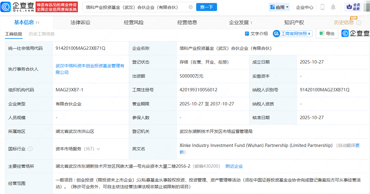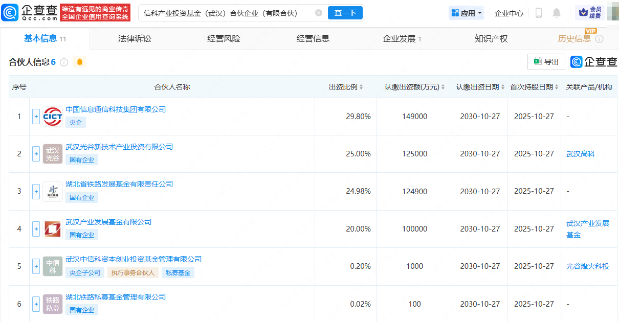 企查查APP显示,近日,信科产业投资基金(武汉)合伙企业(有限合伙)成立,出资额50亿元,经营范围包含:创业投资(限投资未上市企业);以私募基金从事股权投资、投资管理、资产管理等活动。企查查股权穿透显示,该基金由中国信息通信科技集团有限公司、武汉产业发展基金有限公司、湖北省铁路发展基金有限责任公司等共同出资。