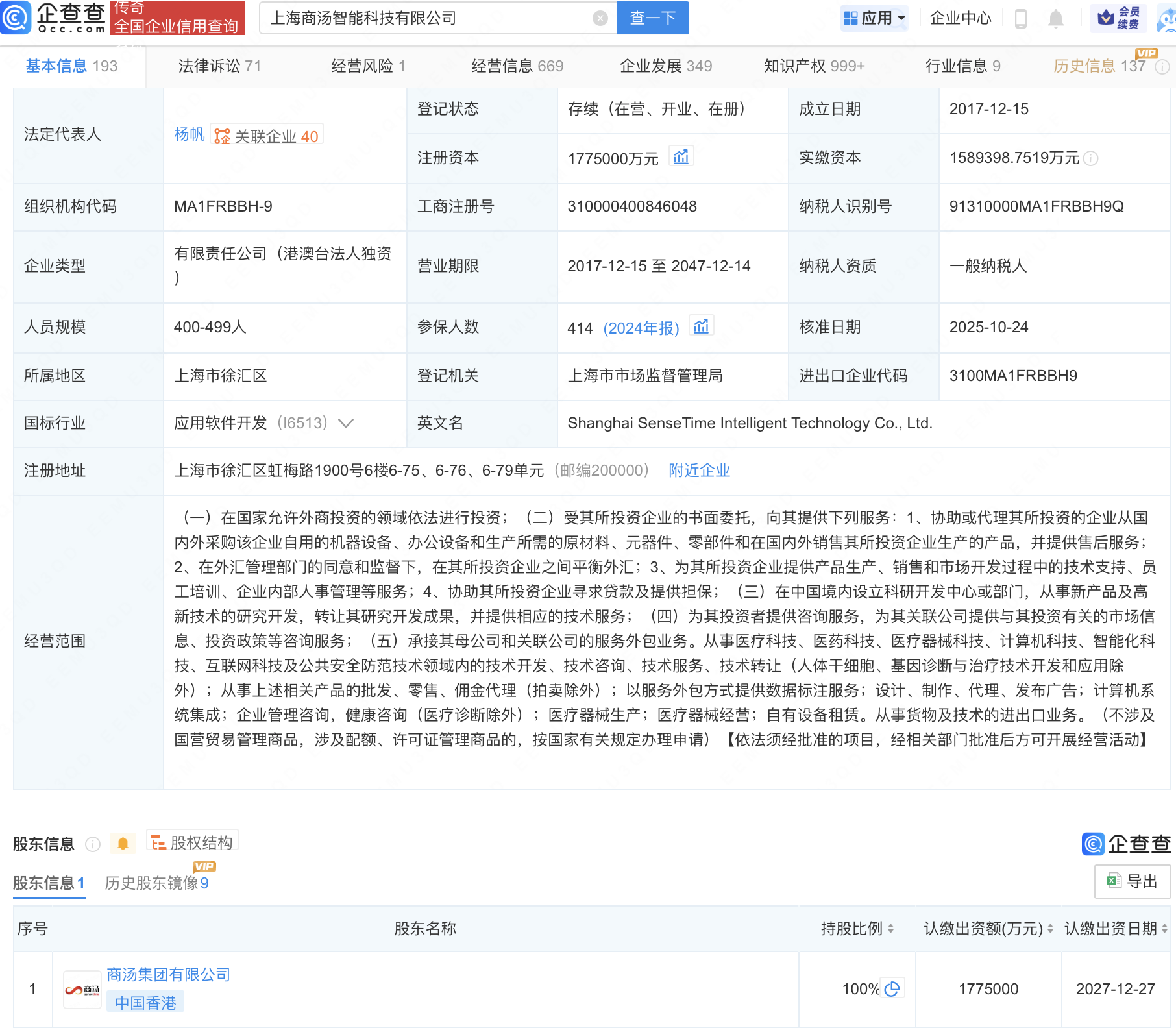 企查查APP显示,近日,上海商汤智能科技有限公司发生工商变更,注册资本由162.5亿元增至177.5亿元。企查查信息显示,该公司成立于2017年,法定代表人为杨帆,由商汤集团有限公司全资持股。