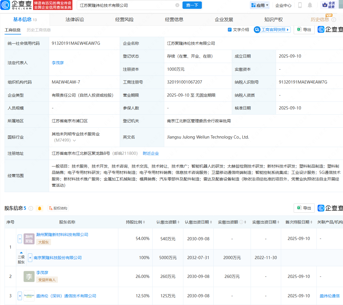 企查查APP显示,近日,江苏聚隆纬伦技术有限公司成立,法定代表人为李茂彦,注册资本为1000万元,经营范围包含:智能机器人的研发;太赫兹检测技术研发;新材料技术研发;卫星移动通信终端制造等。企查查股权穿透显示,该公司由南京聚隆(300644)全资子公司滁州聚隆新材料科技有限公司、李茂彦等共同持股。