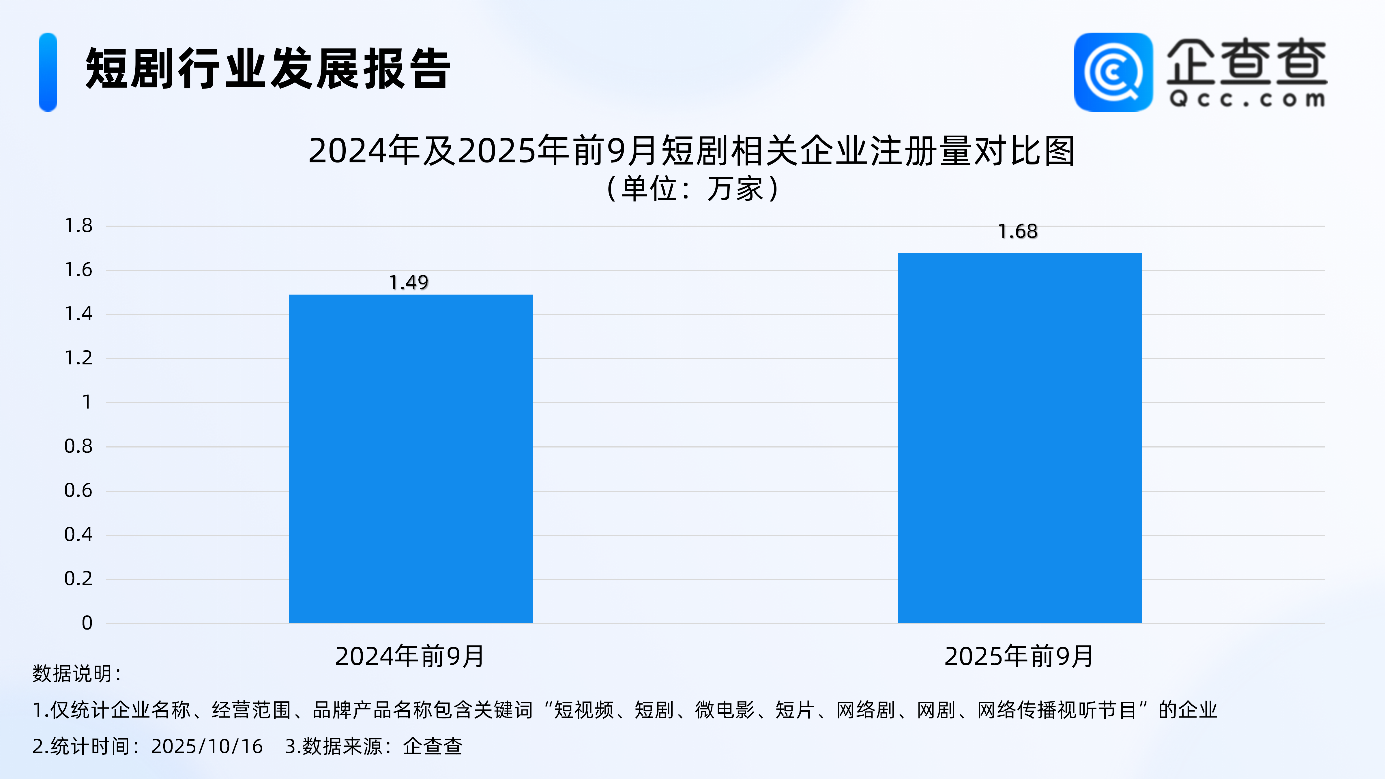 企查查数据显示,国内现存短剧相关企业10.02万家。注册量方面,2023年全年注册量首次突破2万家,同比增长20.92%至2.3万家,达近十年注册量峰值。2024年全年注册1.97万家相关企业,虽较前一年有所下滑,但仍处于高位。截至目前,今年已注册1.73万家短剧相关企业,其中前9月注册1.68万家,同比增长12.57%。