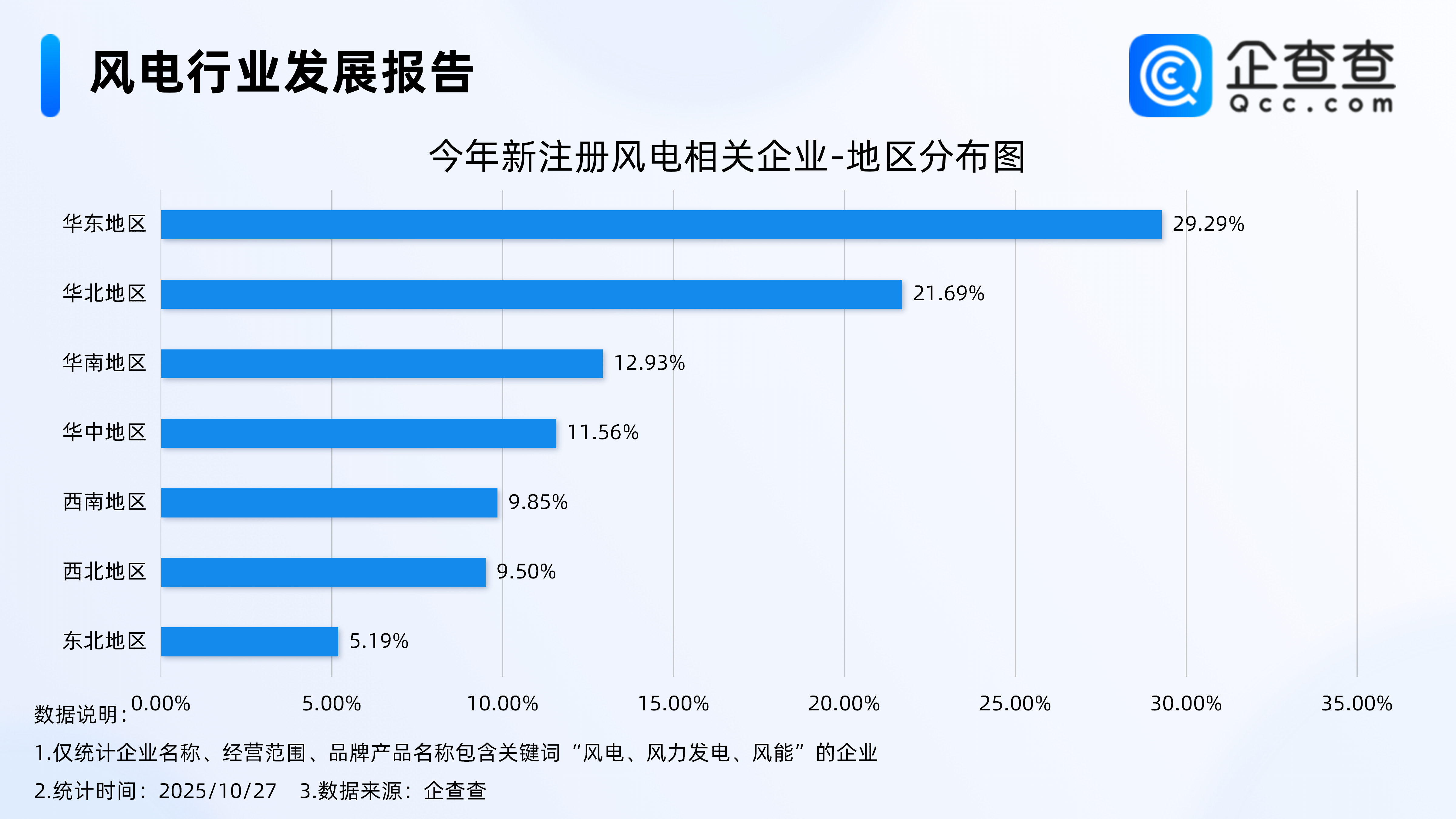 企查查数据显示,从地区分布来看,今年新注册的风电相关企业多分布在华东地区,占比达29.29%。其次,华北地区相关企业贡献率为21.69%。华南地区、华中地区贡献率分别为12.93%、11.56%,其他地区相关企业贡献率均不足10%。