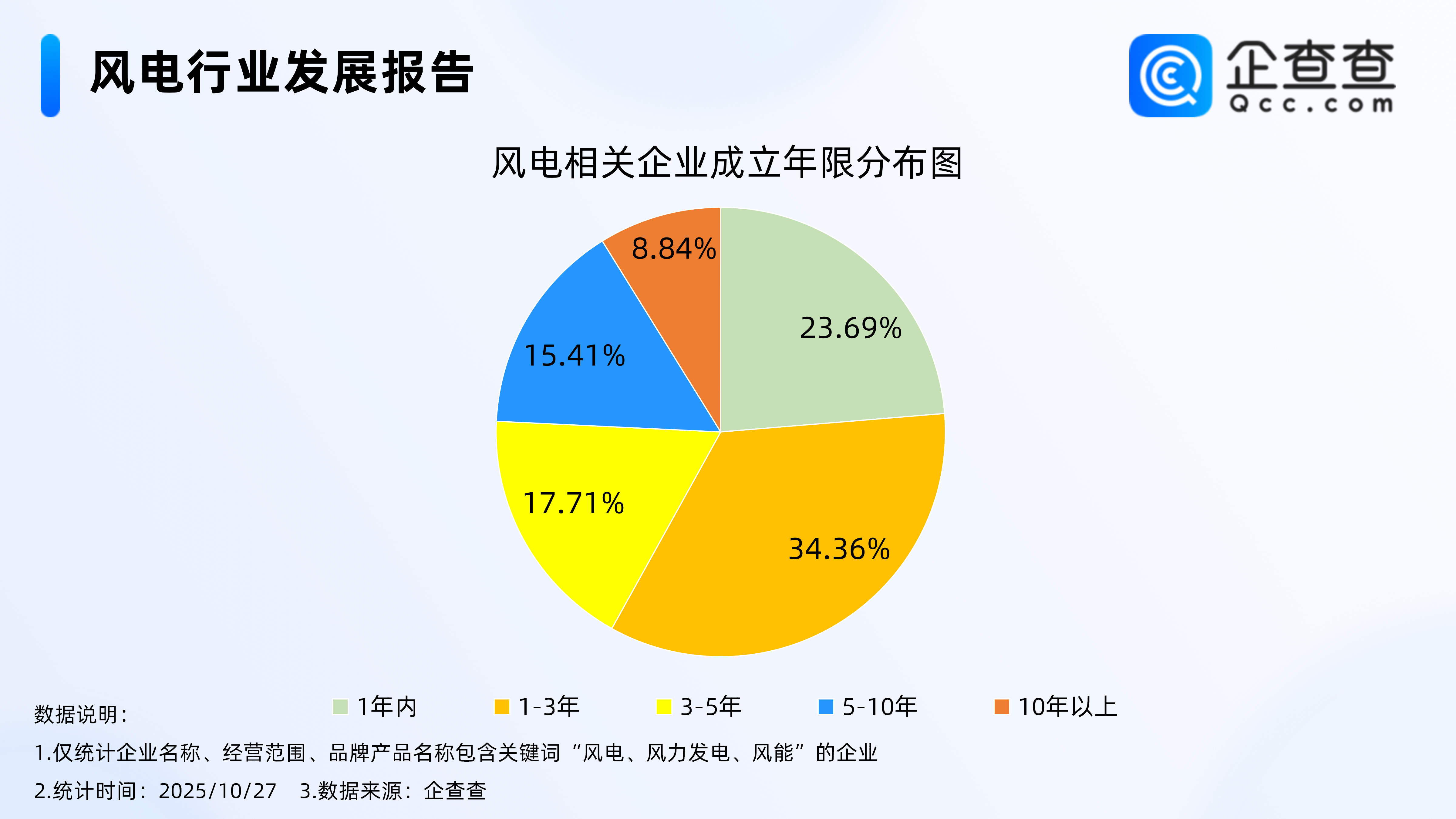 企查查数据显示,从经营时间来看,风电相关企业多成立于近三年,成立年限在1-3年的相关企业最多,占比34.36%。其次,成立年限在1年内的风电相关企业占比23.69%。