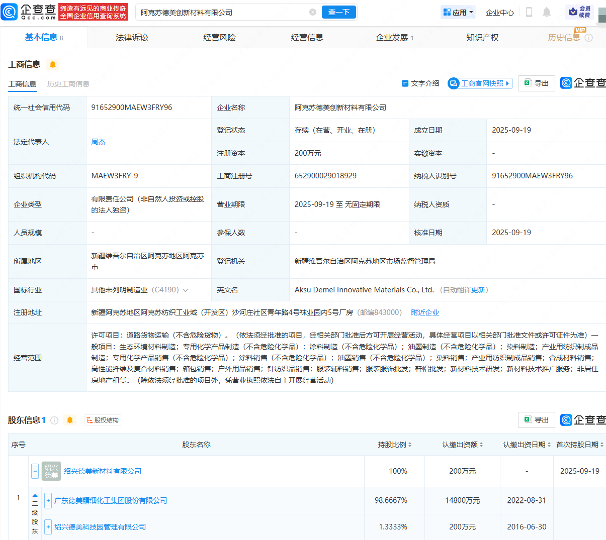 企查查APP显示,近日,阿克苏德美创新材料有限公司成立,法定代表人为周杰,经营范围包含:生态环境材料制造;涂料制造(不含危险化学品);油墨制造(不含危险化学品);染料制造;染料销售等。企查查股权穿透显示,该公司由德美化工(002054)控股的绍兴德美新材料有限公司全资持股。