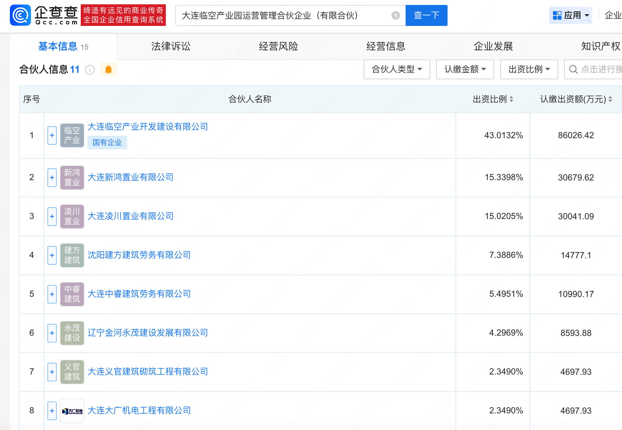 企查查APP显示,近日,大连临空产业园运营管理合伙企业(有限合伙)成立,执行事务合伙人为大连临空产业园发展有限公司,出资额20亿人民币,经营范围含园区管理服务、以自有资金从事投资活动。企查查股权穿透显示,该合伙企业由大连临空产业开发建设有限公司、大连新鸿置业有限公司、大连凌川置业有限公司等共同出资。