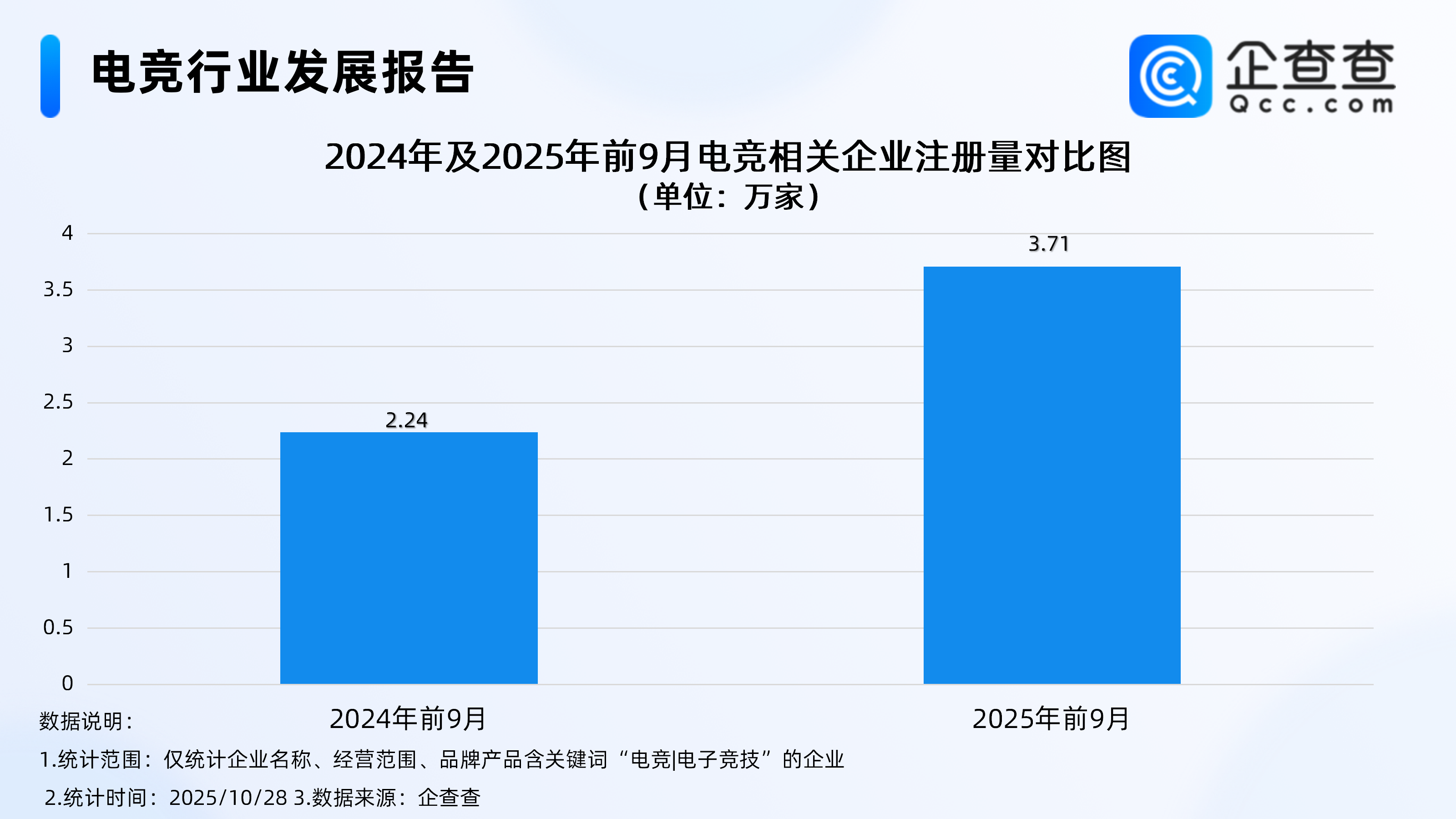 企查查数据显示,截至目前,今年已注册4.02万家电竞相关企业,已超去年全年注册水平。其中前9月注册量达3.71万家,同比增长65.72%。