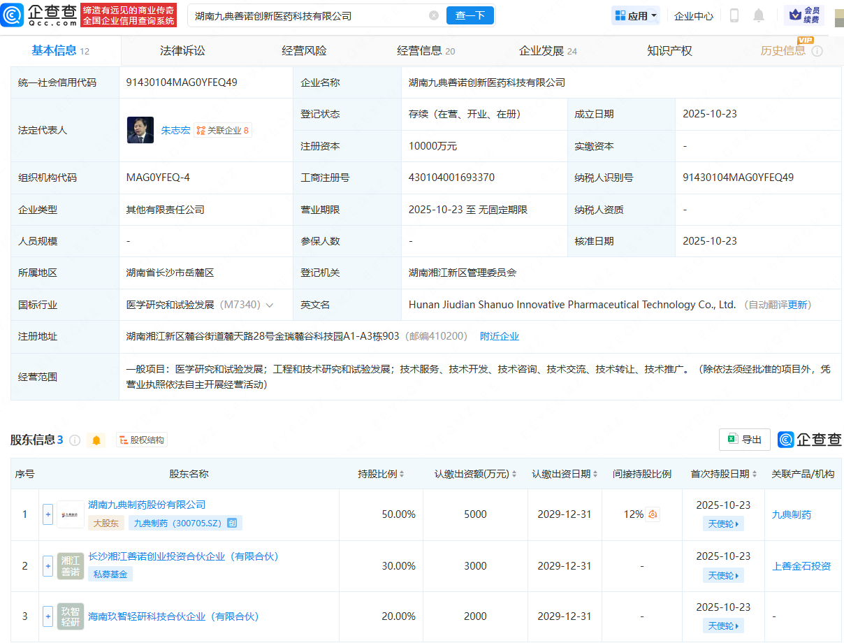企查查APP显示,近日,湖南九典善诺创新医药科技有限公司成立,法定代表人为朱志宏,注册资本为1亿元,经营范围包含:医学研究和试验发展;工程和技术研究和试验发展等。企查查股权穿透显示,该公司由九典制药(300705)、长沙湘江善诺创业投资合伙企业(有限合伙)等共同持股。