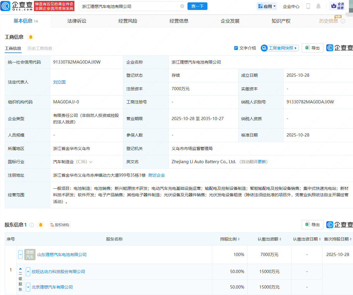企查查APP显示,近日,浙江理想汽车电池有限公司成立,法定代表人为刘立国,注册资本为7000万元,经营范围包含:电池制造;电池销售;新兴能源技术研发;电动汽车充电基础设施运营;输配电及控制设备制造等。企查查股权穿透显示,该公司由山东理想汽车电池有限公司全资持股,后者由欣旺达动力科技股份有限公司、北京理想汽车有限公司共同持股。