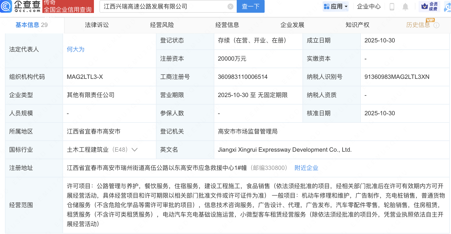 企查查APP显示,近日,江西兴瑞高速公路发展有限公司成立,注册资本2亿元,经营范围包含:公路管理与养护,餐饮服务,住宿服务,建设工程施工等。企查查股权穿透显示,该公司由中国中铁(601390)全资子公司中铁交通投资集团有限公司、中国交建(601800)全资子公司中交投资有限公司等共同持股。
