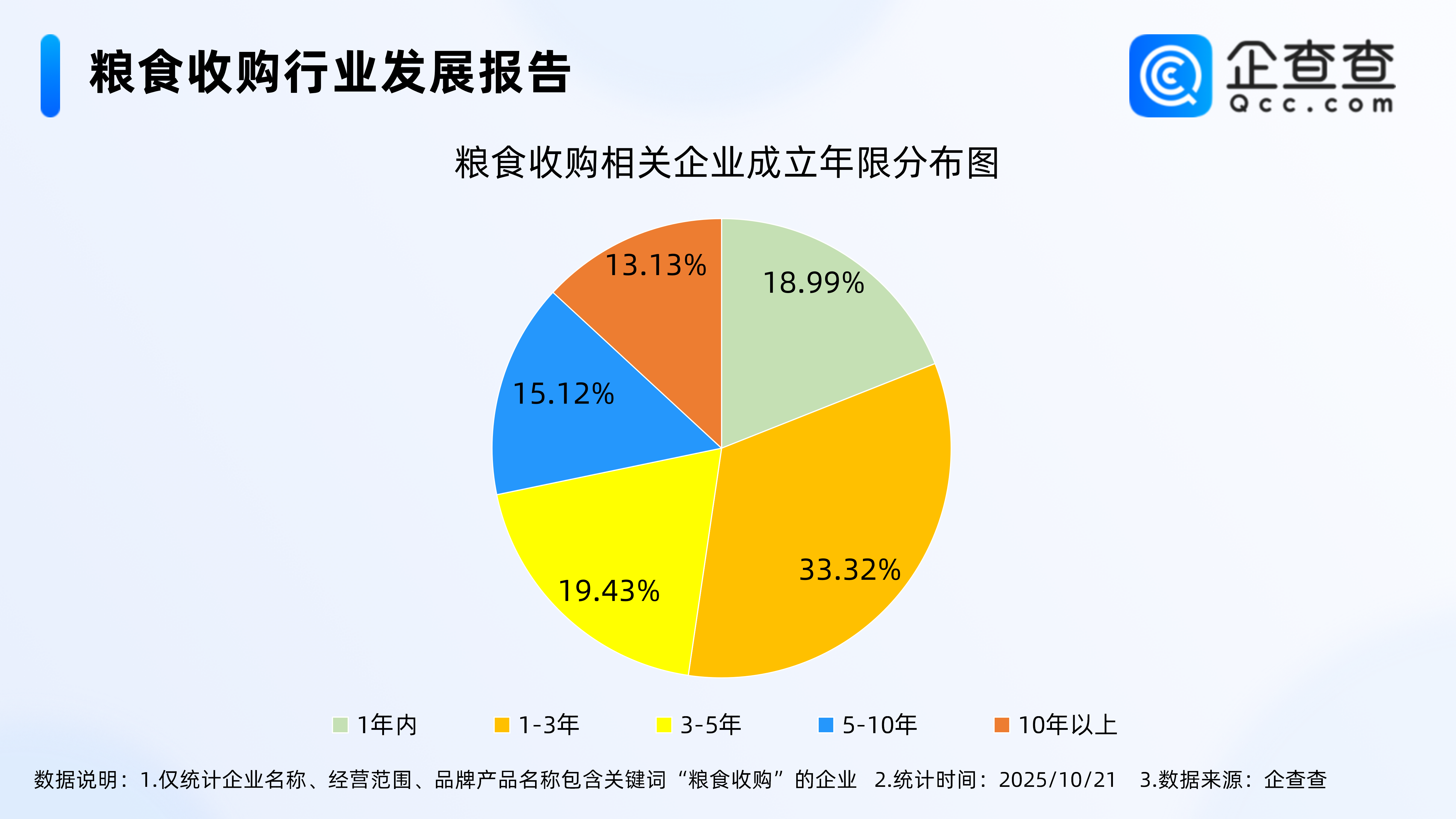 企查查数据显示,国内现存粮食收购相关企业63.8万家。从经营时间来看,成立年限在1-3年的粮食收购相关企业最多,占比达33.32%。其次,成立年限在3-5年、1年内的相关企业分别占比19.43%、18.99%。