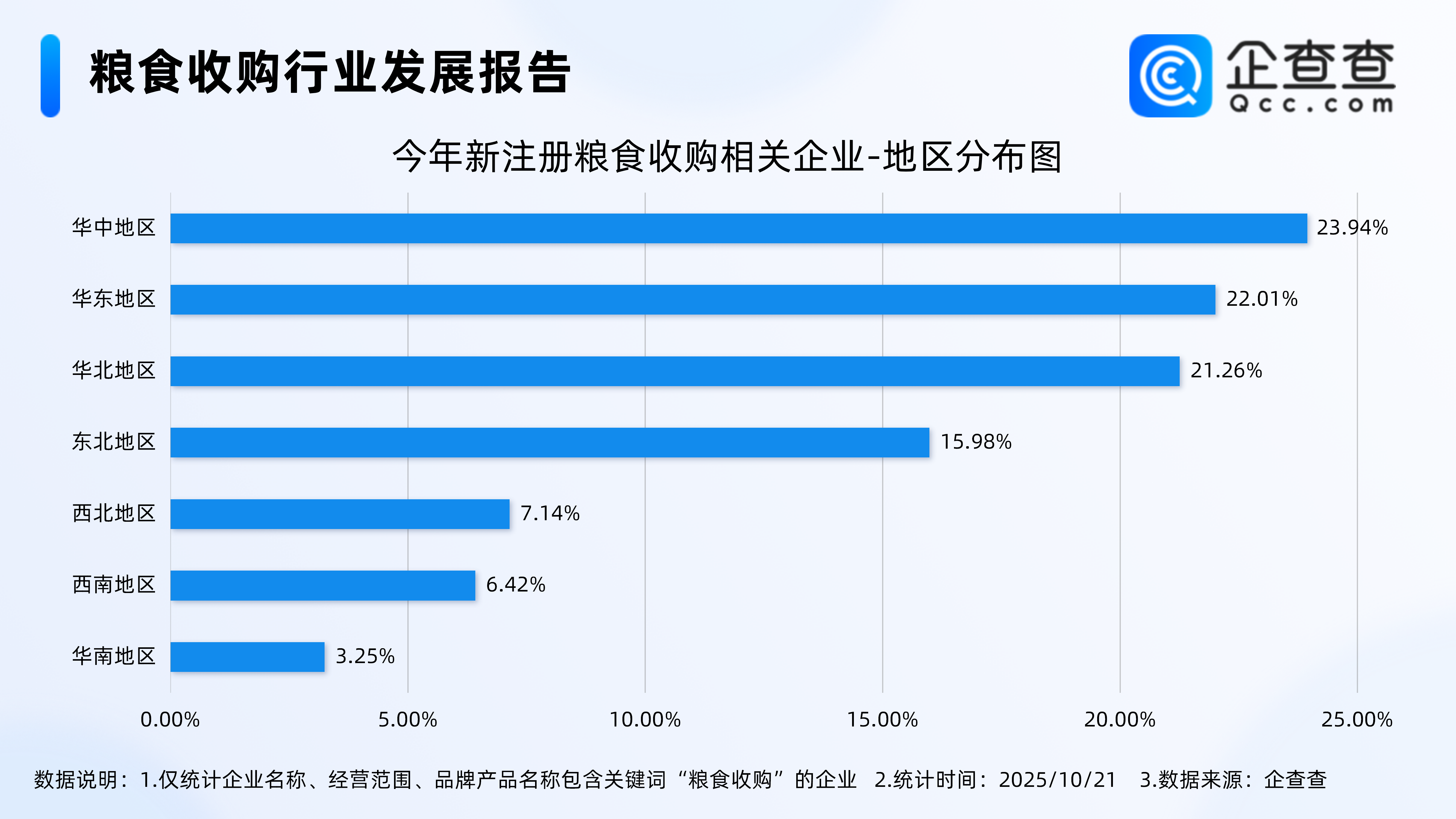 企查查数据显示,从地区分布来看,今年新注册的粮食收购相关企业多分布在华中地区、华东地区、华北地区,分别占比23.94%、22.01%、21.26%。其次,东北地区相关企业贡献率为15.98%。此外,其他地区贡献率均不足10%。