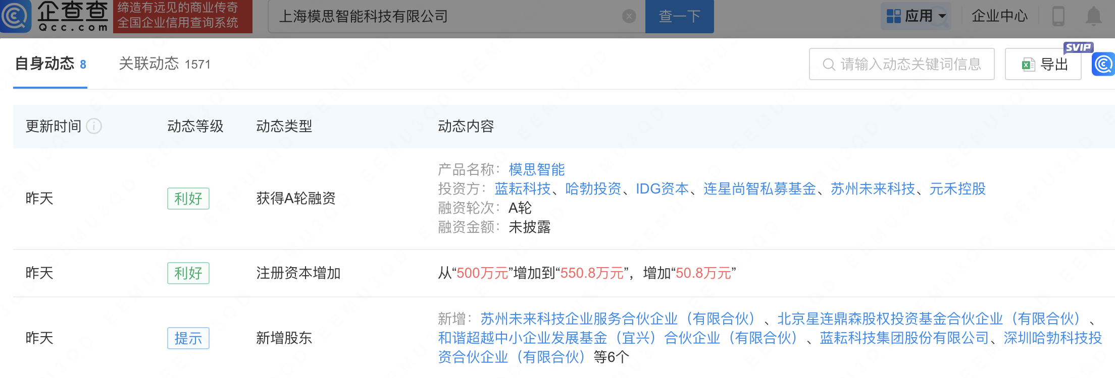 企查查APP显示,近日,上海模思智能科技有限公司发生工商变更,新增深圳哈勃科技投资合伙企业(有限合伙)等为股东,同时注册资本增至550.8万元。企查查信息显示,该公司成立于2024年,法定代表人为李世民,经营范围包含:人工智能公共数据平台;人工智能通用应用系统;智能机器人的研发;智能机器人销售等。公开信息显示,模思智能是一家人工智能企业,专注于情景智能领域,研发语音大模型和强交互多模态大模型。