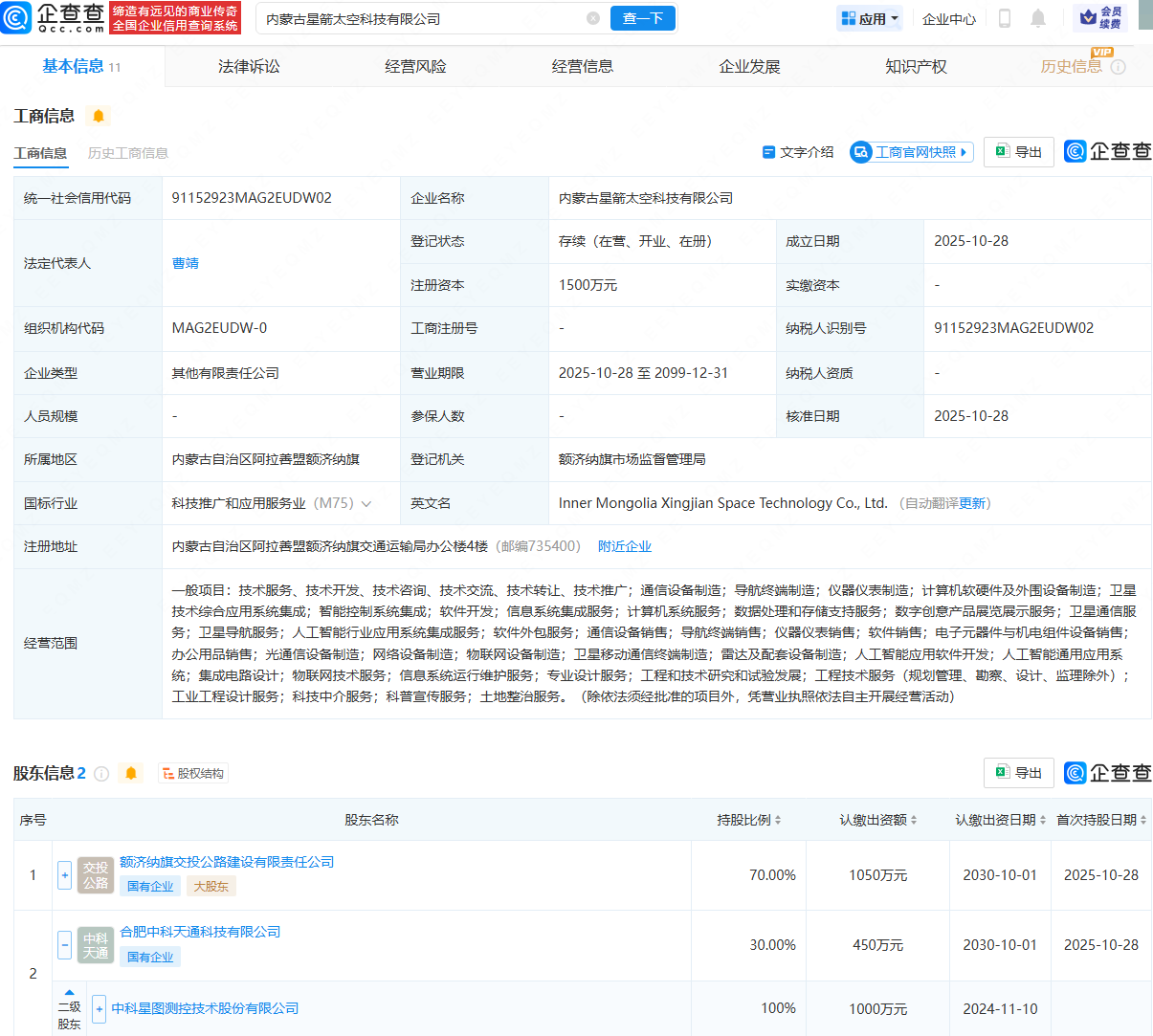 企查查APP显示,近日,内蒙古星箭太空科技有限公司成立,法定代表人为曹靖,注册资本为1500万元,经营范围包含:通信设备制造;导航终端制造;卫星通信服务;卫星导航服务;雷达及配套设备制造等。企查查股权穿透显示,该公司由额济纳旗交投公路建设有限责任公司、星图测控(920116)全资子公司合肥中科天通科技有限公司共同持股。