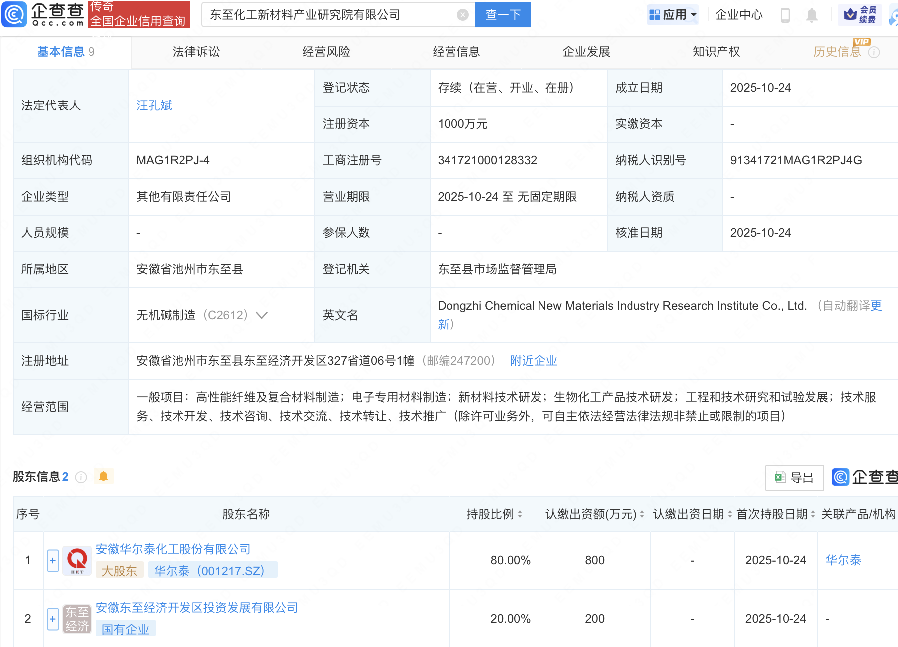 企查查APP显示,近日,东至化工新材料产业研究院有限公司成立,注册资本1000万元,经营范围包含:高性能纤维及复合材料制造;电子专用材料制造;新材料技术研发;生物化工产品技术研发等。企查查股权穿透显示,该公司由华尔泰(001217)等共同持股。