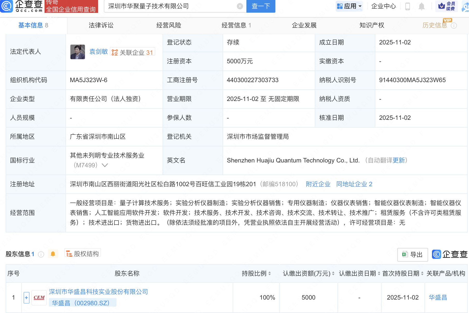 企查查APP显示,近日,深圳市华聚量子技术有限公司成立,注册资本5000万元,经营范围包含:量子计算技术服务;智能仪器仪表销售;人工智能应用软件开发;软件开发等。企查查股权穿透显示,该公司由华盛昌(002980)全资持股。