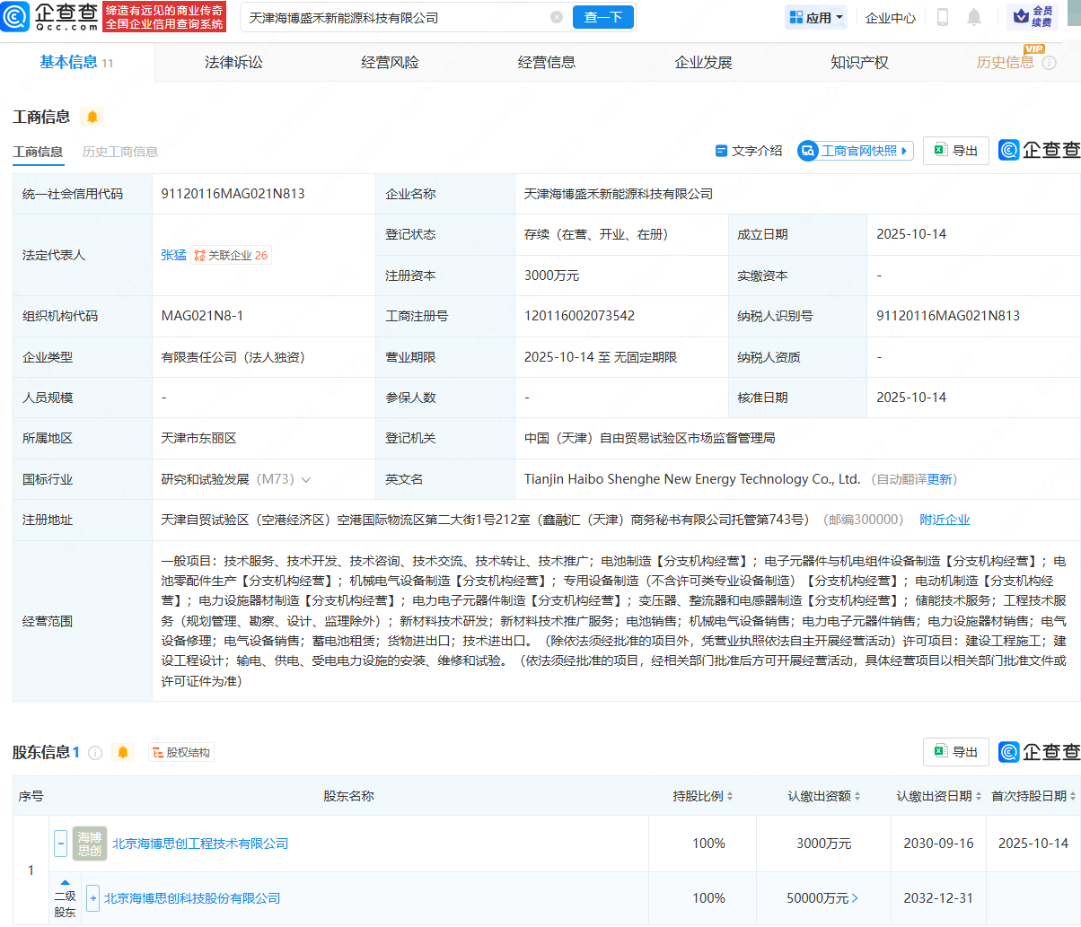 企查查APP显示,近日,天津海博盛禾新能源科技有限公司成立,法定代表人为张猛,注册资本为3000万元,经营范围包含:电池制造;储能技术服务;新材料技术研发;新材料技术推广服务;电池销售等。企查查股权穿透显示,该公司由海博思创(688411)间接全资持股。