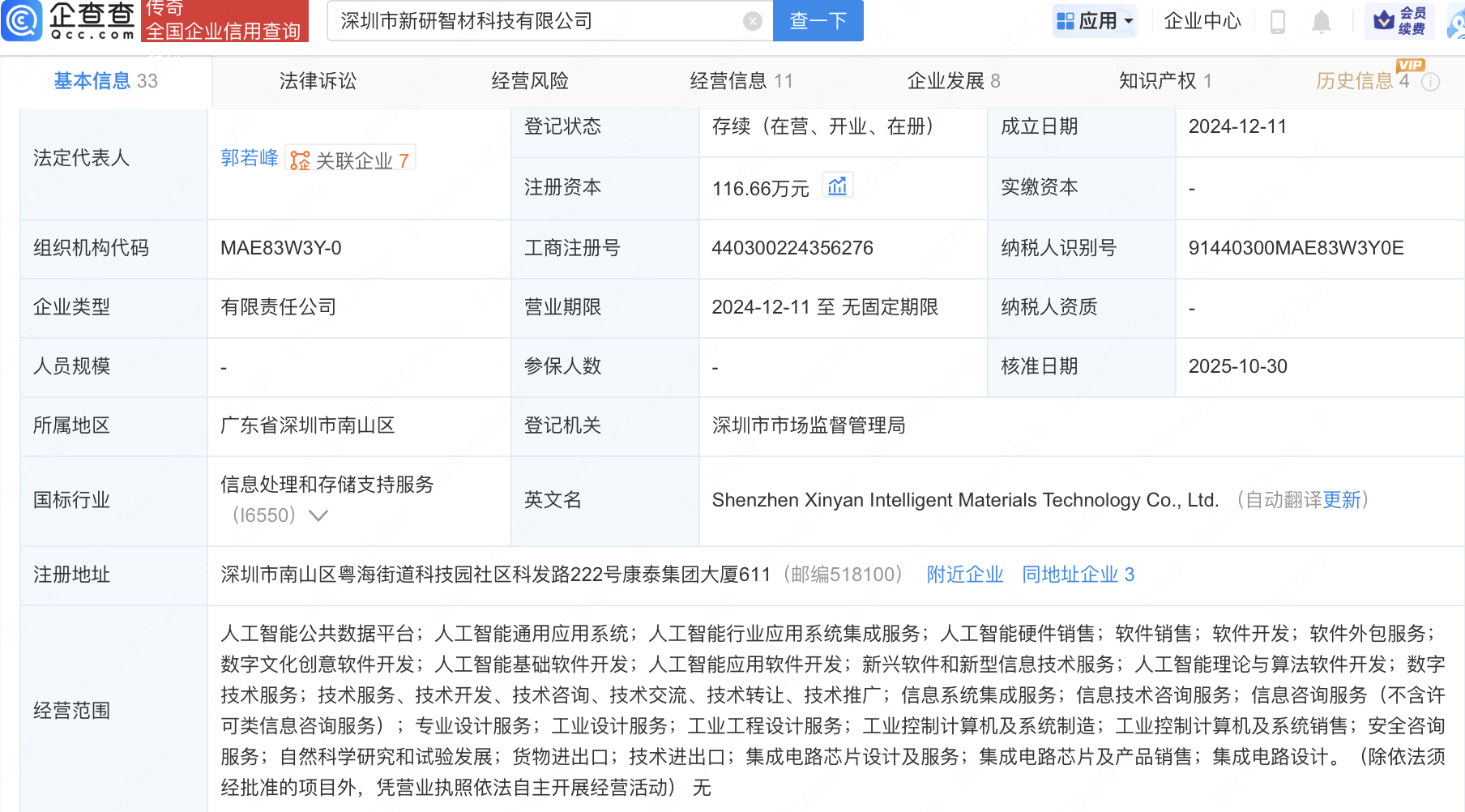 企查查APP显示,近日,深圳市新研智材科技有限公司发生工商变更,新增晶瑞电材(300655)等为股东,同时注册资本增至116.66万元。企查查信息显示,该公司成立于2024年,法定代表人为郭若峰,经营范围包含:人工智能公共数据平台;人工智能通用应用系统;人工智能行业应用系统集成服务;人工智能硬件销售等。公开信息显示,新研智材是一家AI驱动材料研发的创新企业。